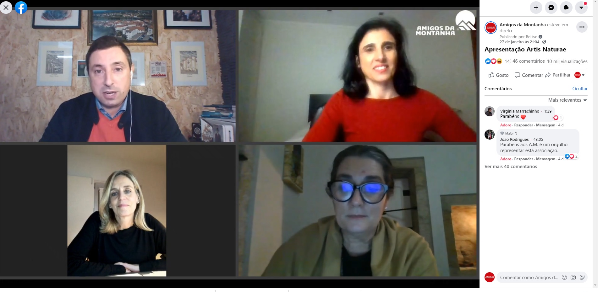 Elisabete Rocha, dos Amigos da Montanha, relembrou que desde a sua constituição, em 1999, a Associação sempre esteve ligada à intervenção e preocupação ambiental e, como Instituição de Utilidade Pública, baseia a sua atuação na comunidade numa união de esforços e mais-valias entre as áreas do desporto, do ambiente e da inovação social. Agradeceu, também, a todos os mecenas que se associaram a este projeto e a todos os patrocinadores que durante o ano de 2020, com todas as dificuldades decorrentes da pandemia, continuaram a apoiar os Amigos da Montanha, o “nos deixa orgulhosos” pois, para “além do apoio financeiro” esta presença em tempos difíceis, significa o “reconhecimento do trabalho que é feito”, realçou. Agradecendo a todas as entidades presentes, referiu, ainda, que além da apresentação do Artis Naturae, esta sessão permitiu ainda uma importante reflexão sobre esta temática de inovação social.