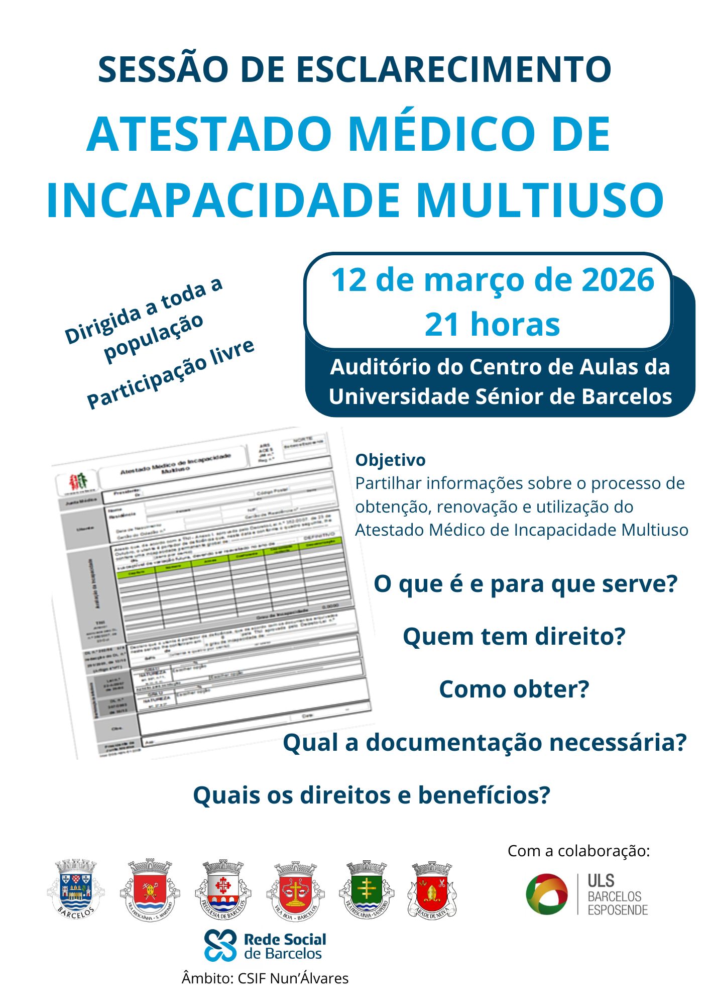 A Junta de Freguesia de Vila Frescaínha (São Martinho), no âmbito da CSIF Nun’Álvares, vai promover, no próximo dia 12 de março, pelas 21h, no Auditório do Centro de Aulas da Universidade Sénior de Barcelos, uma Sessão de Esclarecimento sobre o Atestado Médico de Incapacidade Multiuso, dirigida a toda a população e com participação livre