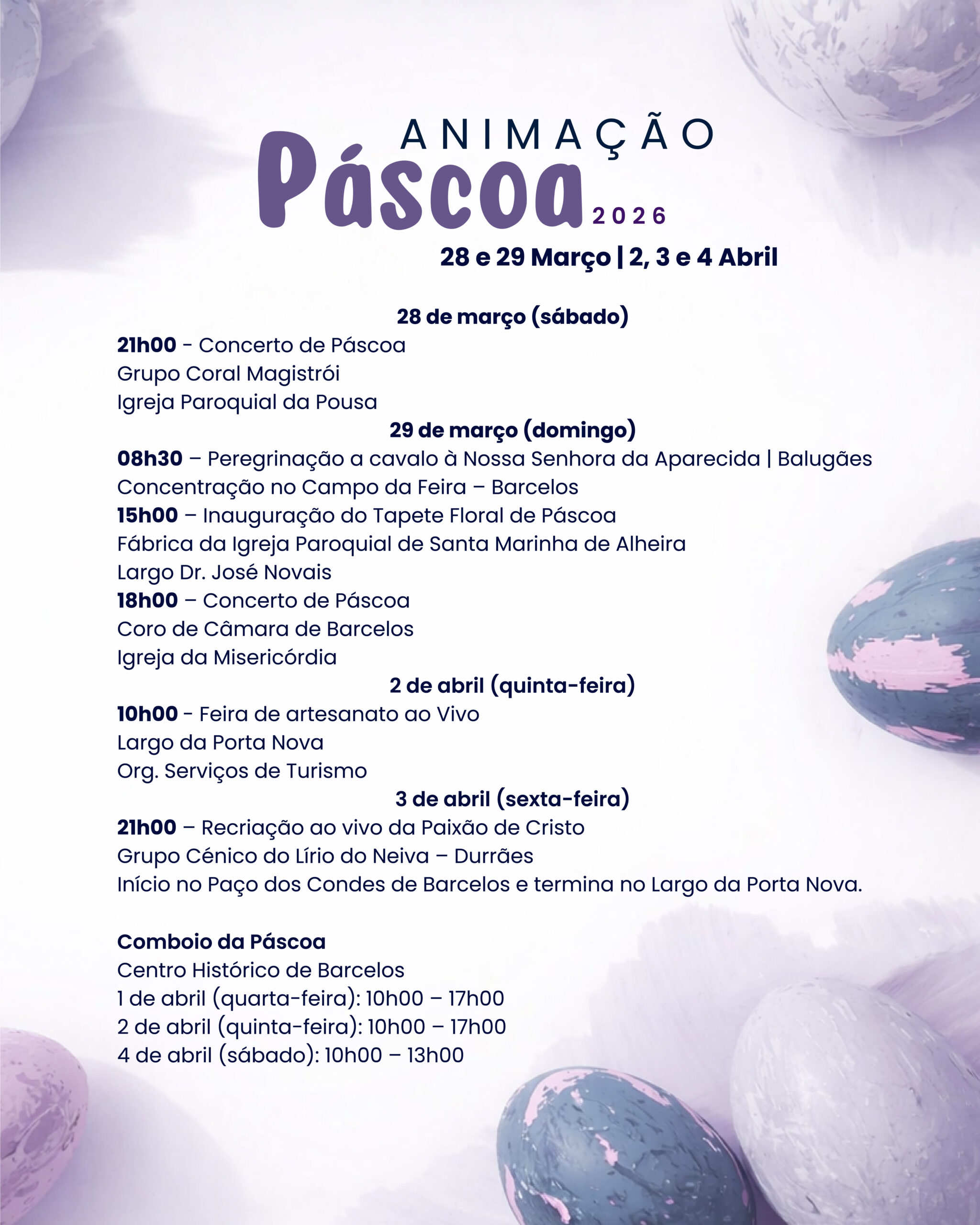 O Município de Barcelos preparou um programa de animação para assinalar a Páscoa, convidando a comunidade e os visitantes a celebrar a data com cultura e tradição. A programação, que decorre nos dias 28 e 29 de março e de 2 a 4 de abril, inclui concertos em espaços emblemáticos da cidade, artesanato ao vivo, tapete de flores e recriações históricas, oferecendo uma experiência diversificada ao público.