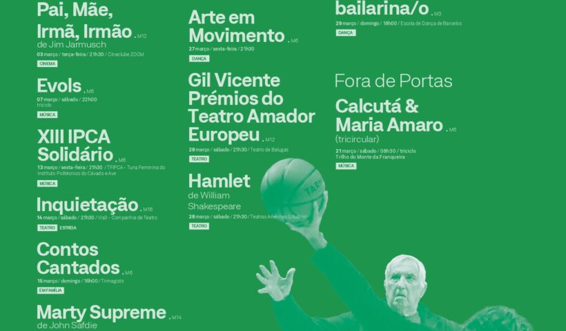 O Theatro Gil Vicente (TGV) apresenta, ao longo do mês de março, uma programação diversificada que integra teatro, dança, música, cinema, stand-up, propostas para bebés…