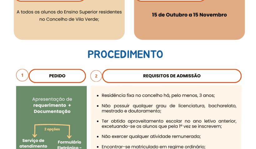 O Município de Vila Verde tem em aberto o prazo para os estudantes do concelho que frequentam o ensino superior, no ano letivo 2025/2026, apresentarem…