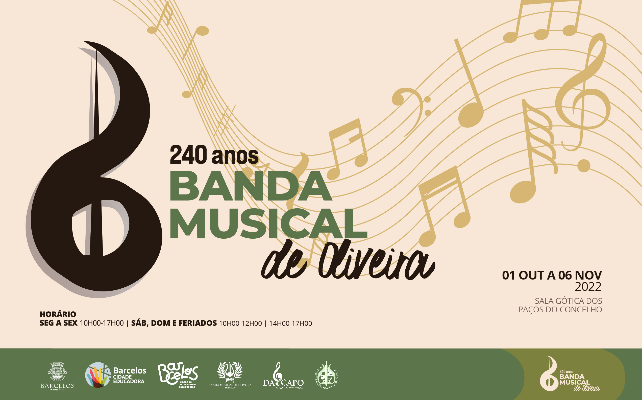 É inaugurada, no próximo sábado, na Sala Gótica dos Paços do Concelho, a exposição "240 anos da Banda Musical de Oliveira", que vai ficar patente ao público até ao dia 6 de novembro . A iniciativa acontece no âmbito da celebração do Dia Mundial da Música (1 de outubro) e visa assinalar as comemorações dos 240 anos da Banda Musical de Oliveira. Esta iniciativa, preparada pelos serviços municipais, pretende dar a conhecer o património e história da mais antiga banda barcelense. Para além da fundação, a narrativa expositiva inclui os instrumentos, as partituras, o fardamento, alusão a figuras de relevância para o desenvolvimento da banda, bem como as condecorações e os projetos atuais. Os instrumentos expostos foram recolhidos pelos elementos da banda para aumentar o seu espólio histórico, demonstrando a importância que dão ao património imaterial e material. A título de curiosidade, e porque é a prova de um período histórico conturbado, destaca-se o Carrilhão de Sinos (com datação provável entre 1939 e 1950). Atualmente, a Banda Musical de Oliveira é composta por 70 músicos e dirigida pelo maestro Alfredo Macedo. A sede, para além de funcionar para os ensaios, é também o local da escola de música, onde cerca de 70 alunos têm aulas de formação musical, de vários instrumentos e de orquestra.