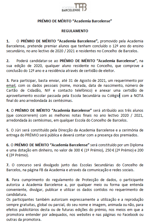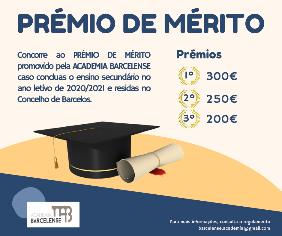 A Academia Barcelense instituiu um prémio de mérito escolar a atribuir aos melhores alunos/as de todas as escolas públicas e privadas do concelho, que terminaram o 12º ano.