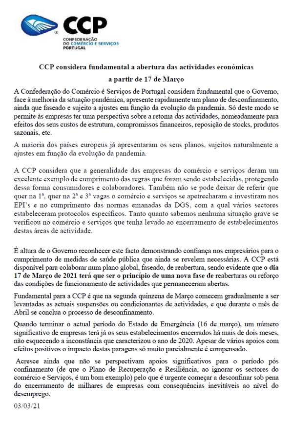 A ACIB em nota enviada às redações, informa que apoia totalmente a visão da CCP – Confederação do Comércio e Serviços de Portugal, que reclama o início do desconfinamento a 17 de Março, considerando o atual nível da situação pandémica, que tem melhorado significativamente.