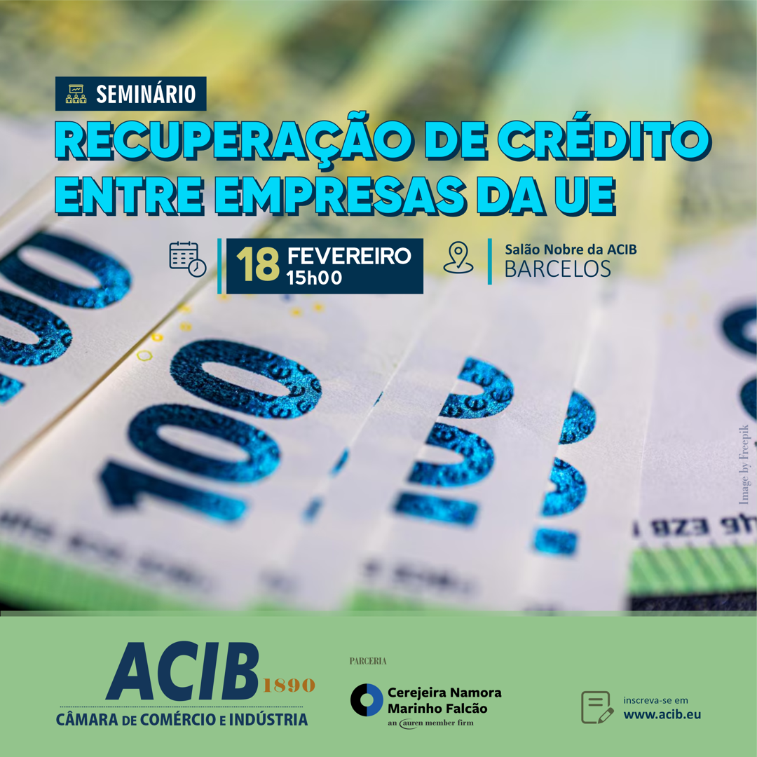 A ACIB – Associação Comercial e Industrial de Barcelos – Câmara de Comércio e Indústria – vai organizar um seminário sobre a "Recuperação de Crédito entre empresas da UE", no dia 18 de fevereiro de 2026, pelas 15h00, no Salão Nobre da ACIB.