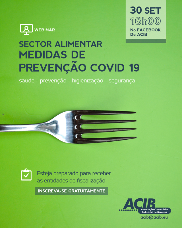 "Com o objetivo de relançar uma atividade valorizada por todos nós, a ACIB - Associação Comercial e Industrial de Barcelos promove no dia 30 de setembro, pelas 16h00, o webinar "SECTOR ALIMENTAR – MEDIDAS DE PREVENÇÃO COVID 19", adaptado ao setor da restauração, com a consultora e formadora Susana Sousa.