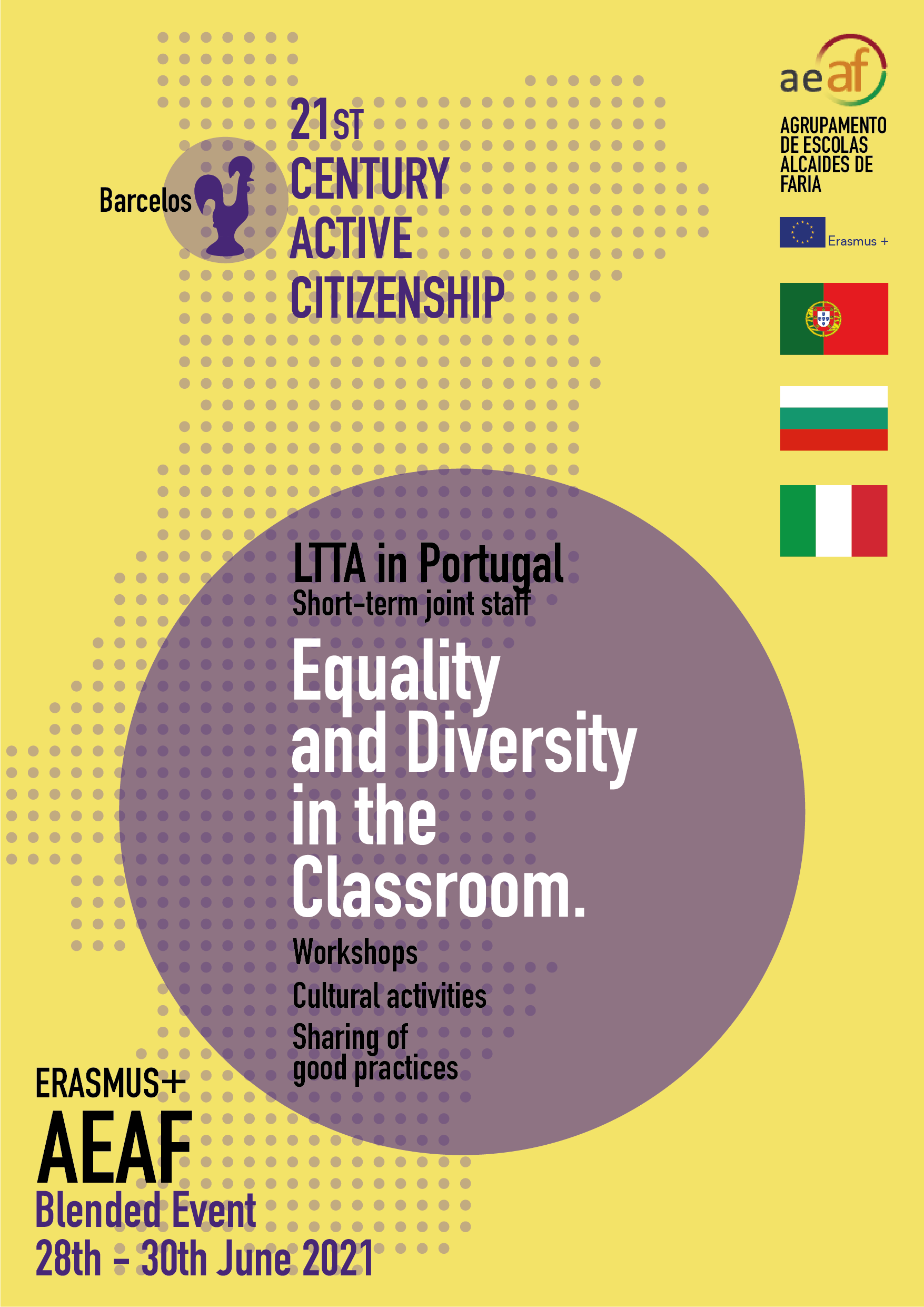 "O Agrupamento de Escolas Alcaides de Faria vai dinamizar o projeto "21st Century Active Citizenship", a decorrer presencialmente e online de 28-30 de junho de 2021. Este projeto, iniciado em 2019, envolve alunos e professores de escolas parceiras da Itália e Bulgária.
