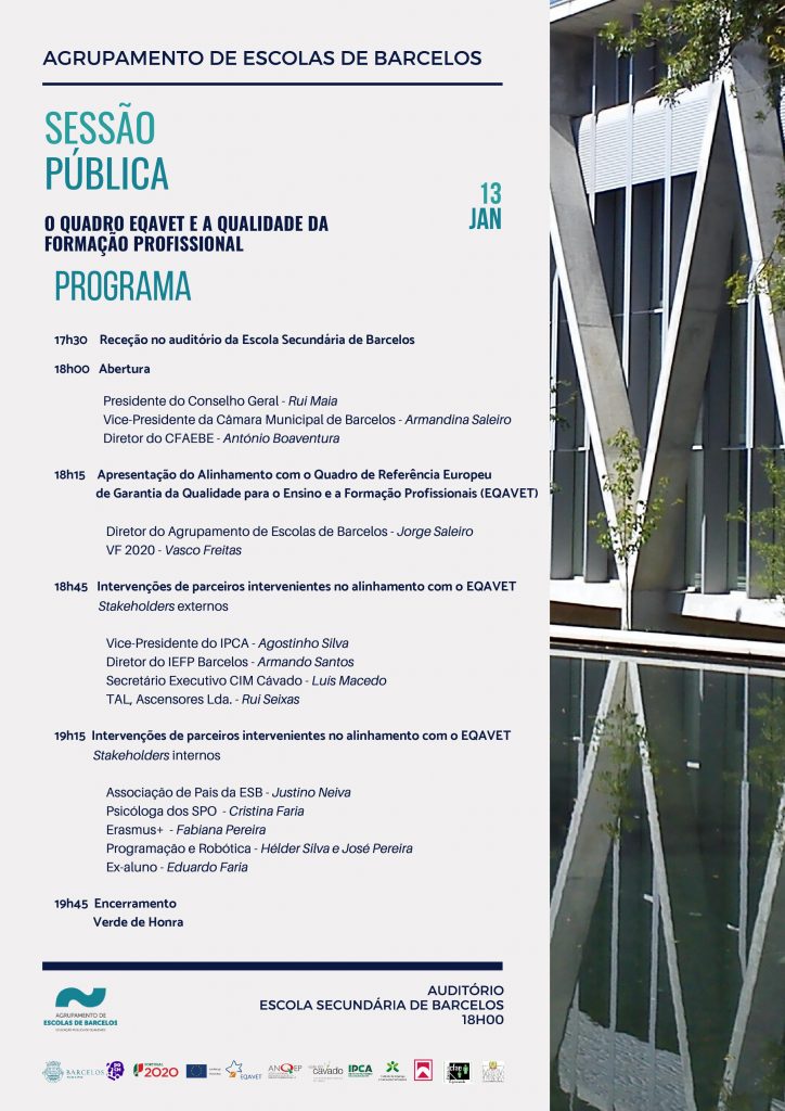 O Agrupamento de Escolas de Barcelos promove, esta segunda-feira, uma sessão pública sobre o ‘Quadro EQAVET e a Qualidade da Formação Profissional”, a partir das 17h30, no Auditório da Escola Secundária de Barcelos.