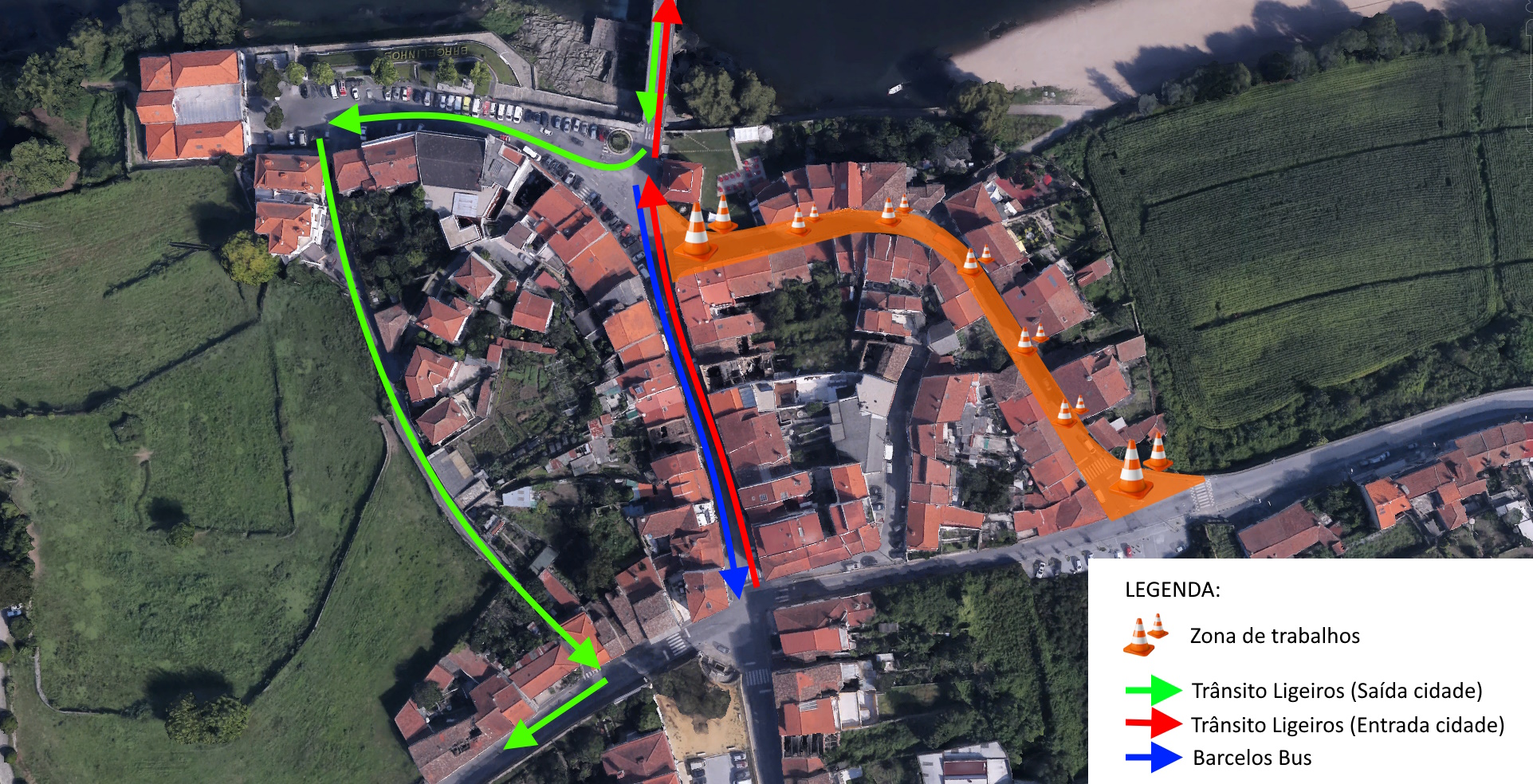 O trânsito sobre a Ponte circulará como habitualmente, mas à saída da cidade será obrigatório virar à direita, passar pelo Largo Guilherme Gomes Fernandes, subir a Rua da Carniçaria, e virar de novo à direita, no sentido da Póvoa de Varzim.