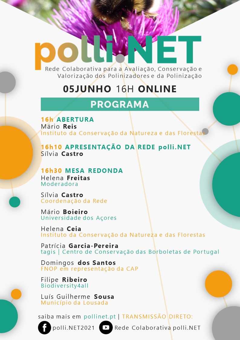 No próximo sábado, 5 de junho às 16h, o Instituto da Conservação da Natureza e das Florestas em conjunto com o Centro de Ecologia Funcional da Universidade de Coimbra, apresenta a Rede Colaborativa para a Avaliação, Conservação e Valorização dos Polinizadores e da Polinização (https://www.pollinet.pt/), num evento público online (páginas do Facebook: https://www.facebook.com/polli.NET2021 e Youtube) que inclui uma mesa-redonda dedicada a consciencializar para a importância dos polinizadores e para os serviços por eles prestados.