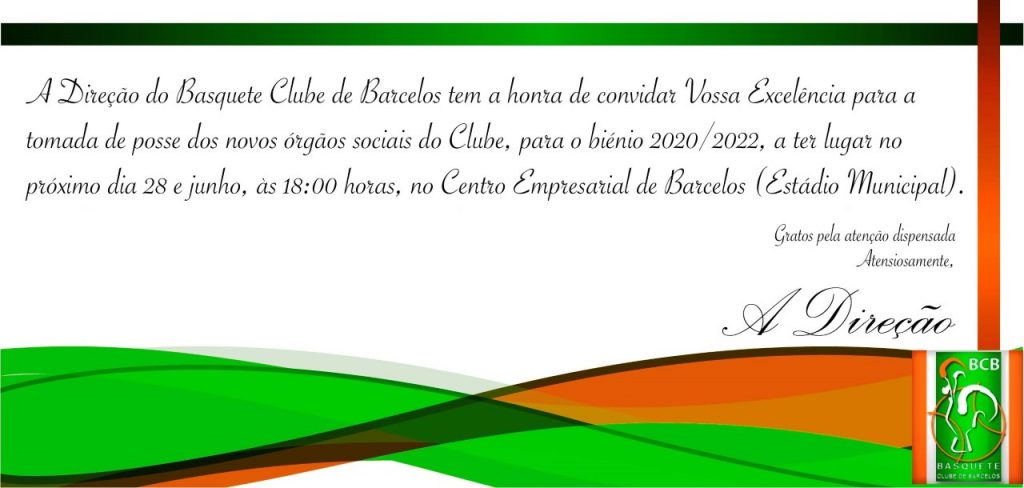 "O Basquete Clube de Barcelos tem a honra de convidar Vossa Excelência para a tomada de posse dos novos órgãos sociais do Clube, para o biénio 2020/2022, a ter lugar no próximo dia 28 de junho, às 18:00 horas, no Centro Empresarial de Barcelos (Estádio Municipal)."