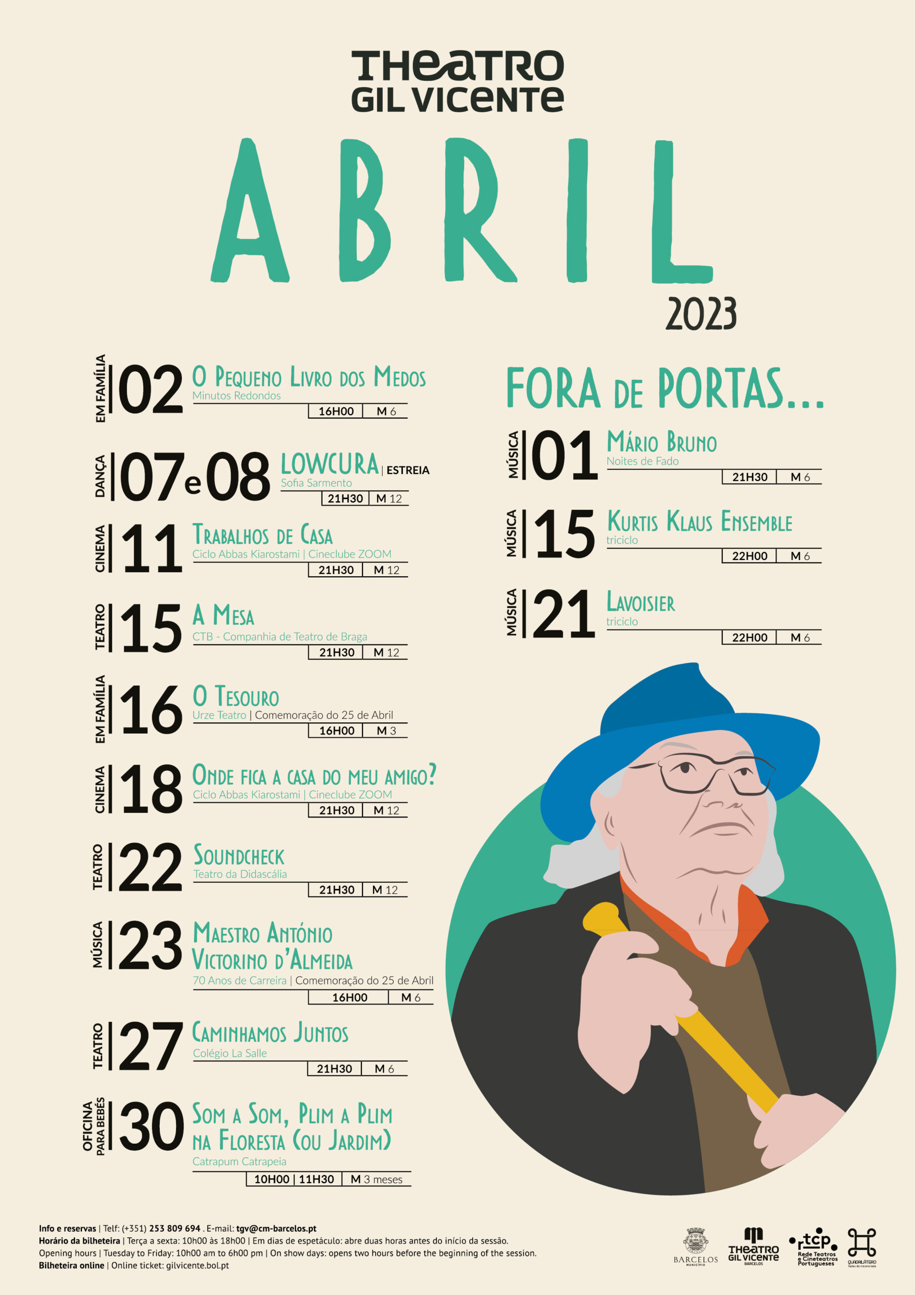 Na programação "Fora de Portas", Mário Bruno apresenta no Salão Nobre dos Paços do Concelho "Noites de Fado", no dia 1 de abril, às 21h30, enquanto no âmbito do ciclo de concertos 'triciclo', a Biblioteca Municipal de Barcelos recebe "Kurtis Klaus Ensemble", às 22h00, do dia 15 de abril. No dia 21 de abril, é a vez da banda "Lavoisier" tocar no auditório dos Paços do Concelho. Os bilhetes para os espetáculos do 'triciclo' só podem ser adquiridos a partir de 27 de março.