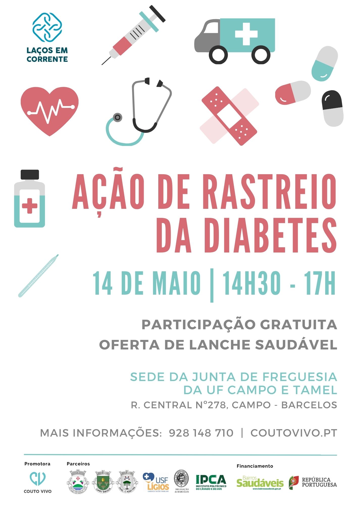 A Couto Vivo - Associação de Apoio Social e Cultural, no âmbito do Projeto «Laços Em Corrente (LEC)» do Programa Bairros Saudáveis, financiado pelo Ministério da Saúde, promove uma Ação de Rastreio da Diabetes, no próximo dia 14 de maio (sábado), das 14:30h às 17:00h, na Sede da Junta de Freguesia da União de Freguesias de Campo e Tamel, na Rua Central, n.º 278, Campo, Barcelos.