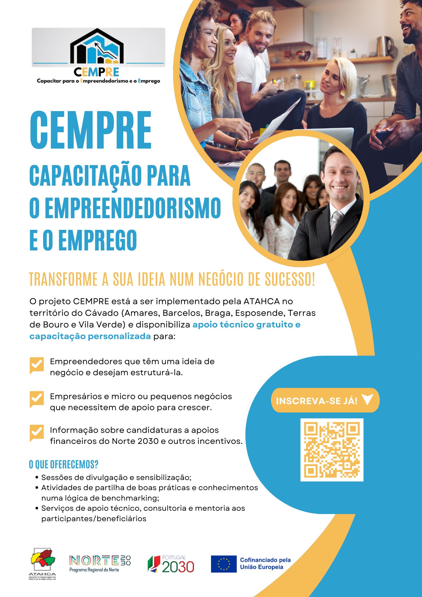 A ATAHCA vai promover, já na próxima quinta-feira, 17 de julho, às 10h00, nas suas instalações em Vila Verde, uma sessão pública de divulgação do projeto CEMPRE – Capacitação para o Empreendedorismo e o Emprego.