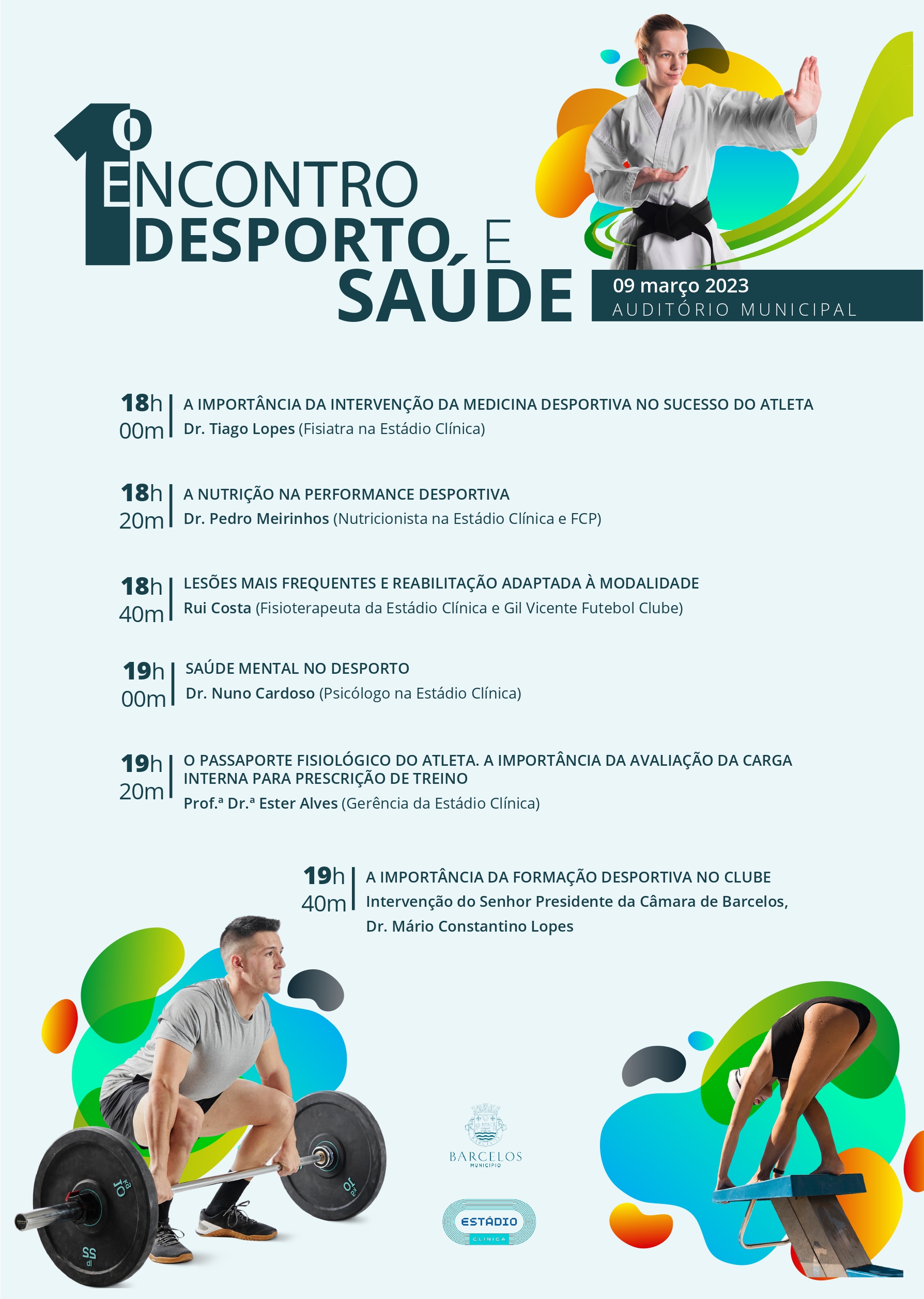 O Município de Barcelos vai acolher o 1.º Encontro Desporto e Saúde. Organizada pela Estádio Clínica, com apoio da Câmara Municipal, a iniciativa realiza-se no próximo dia 9 de março, pelas 18h00, no auditório municipal dos Paços do Concelho.