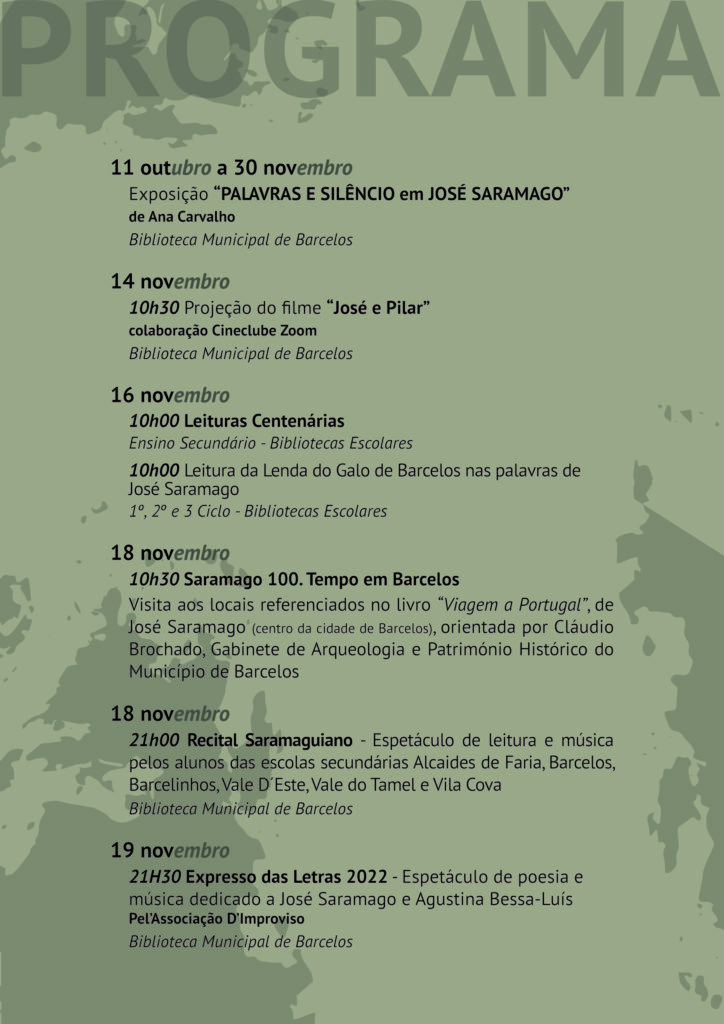 Destaque para o dia 18 de novembro, às 10h30, para um roteiro cultural dedicado a José Saramago, com a visita a alguns locais, no centro da cidade de Barcelos, referenciados na obra "Viagem a Portugal". Ainda no dia 18, à noite, a Biblioteca Municipal recebe o espetáculo de leitura e música pelos alunos das escolas secundárias Alcaides de Faria, Barcelos, Barcelinhos, Vale D'Este, Vale do Tamel e Vila Cova.