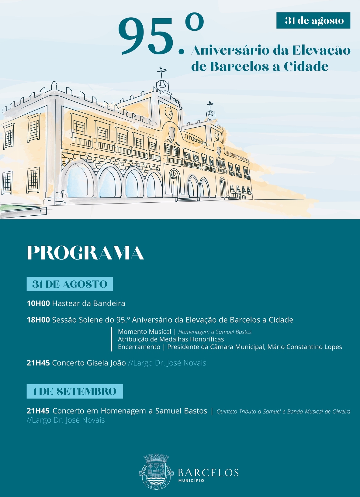 Barcelos vai comemorar, no próximo dia 31 de agosto, os 95 anos de elevação à categoria de cidade. Para celebrar o decreto de 1928, que à época encheu os barcelenses de regozijo e alegria, a Câmara Municipal preparou um programa que além da habitual Sessão Solene, inclui dois concertos musicais.