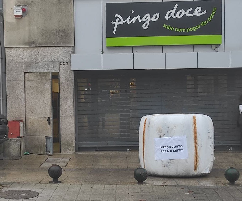 Produtores de leite entregaram esta sexta-feira de manhã um fardo de palha à porta do supermercado Pingo Doce, em Barcelos, em protesto contra os preços baixos do leite. A iniciativa visou também desafiar a insígnia do grupo Jerónimo Martins a parar com a desvalorização do leite e a pagar um preço justo aos agricultores.