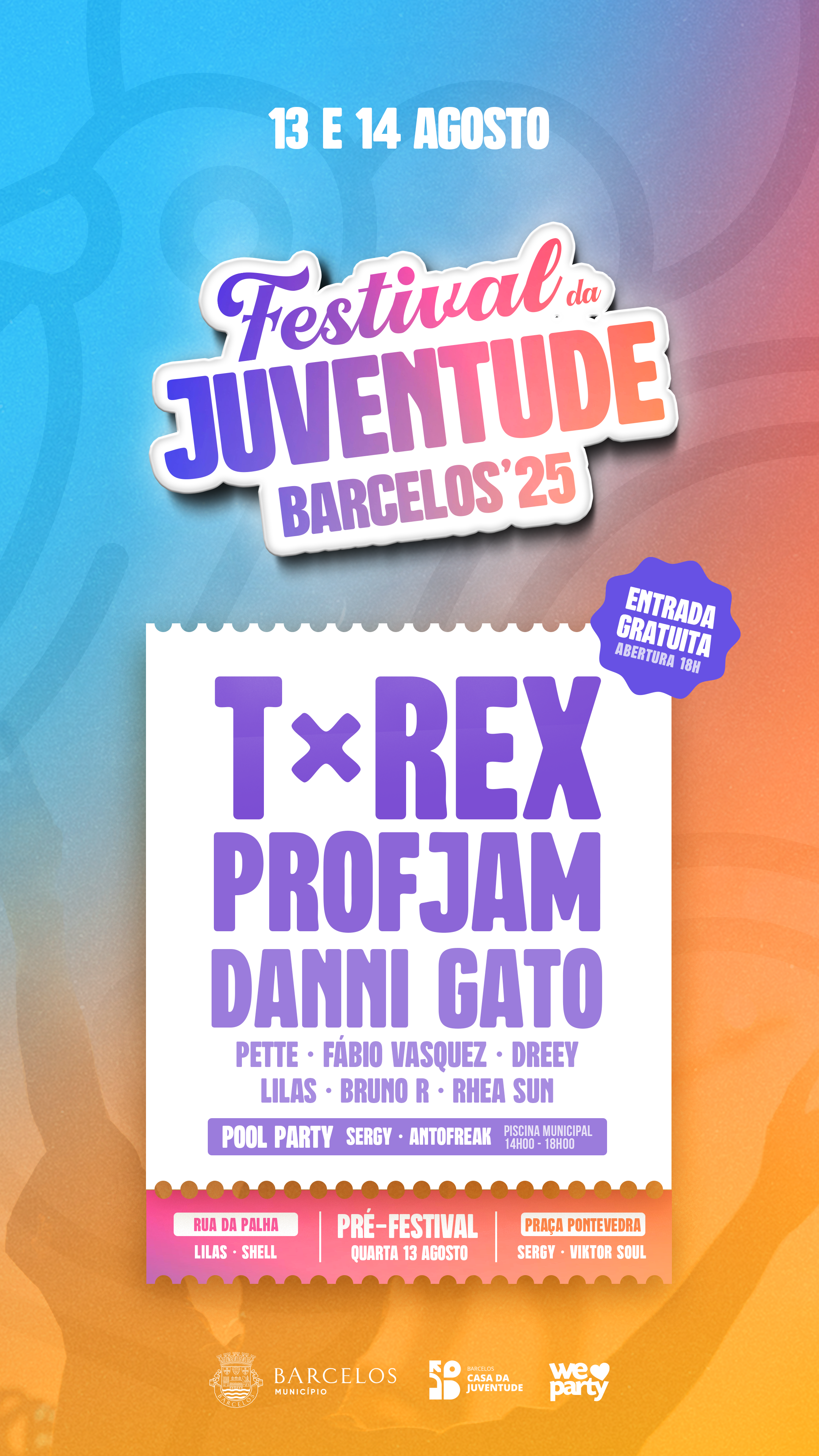 Depois do enorme sucesso das edições anteriores, está de volta a 4.ª edição do Festival da Juventude de Barcelos 2025, um evento que promete arrastar à cidade e à Frente Ribeirinha grandes multidões, tanto mais que o evento comporta dois dias de grande animação – quarta 13 e quinta 14 de agosto, quatro palcos, três artistas cabeça de cartaz, onze dj's e muita animação.