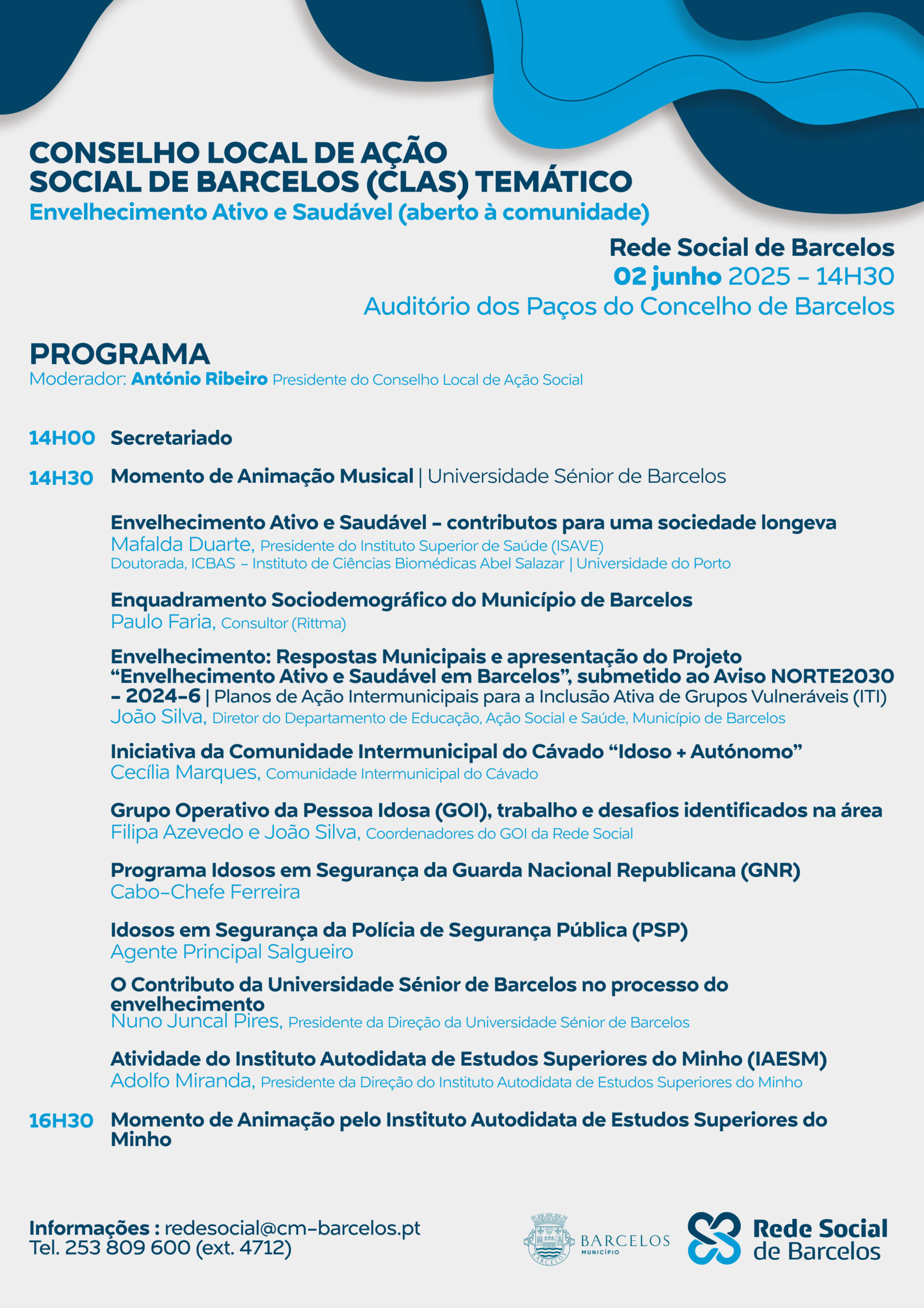 O programa arranca com um momento musical pela Universidade Barcelos Sénior e integra intervenções de várias entidades e especialistas. Entre os oradores previstos estão a Professora Doutora Mafalda Duarte, Presidente do Instituto Superior de Saúde (ISAVE), que abordará os fundamentos do envelhecimento ativo, e representantes de instituições locais e regionais como a Comunidade Intermunicipal do Cávado, o Grupo Operativo da Pessoa Idosa (GOI), a GNR, o Instituto Autodidata de Estudos Superiores do Minho (IAESM) e a própria Universidade Barcelos Sénior.