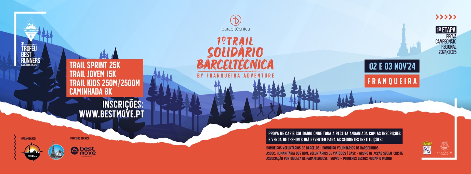 A Barceltécnica está a organizar um Trail solidário no início de novembro. Nos dias 2 e 3 de novembro de 2024, será realizado o Trail Solidário organizado com o apoio técnico da BestMove e em parceria com a Associação Franqueira Adventure, que tem como principal objetivo angariar fundos para algumas instituições Barcelenses.