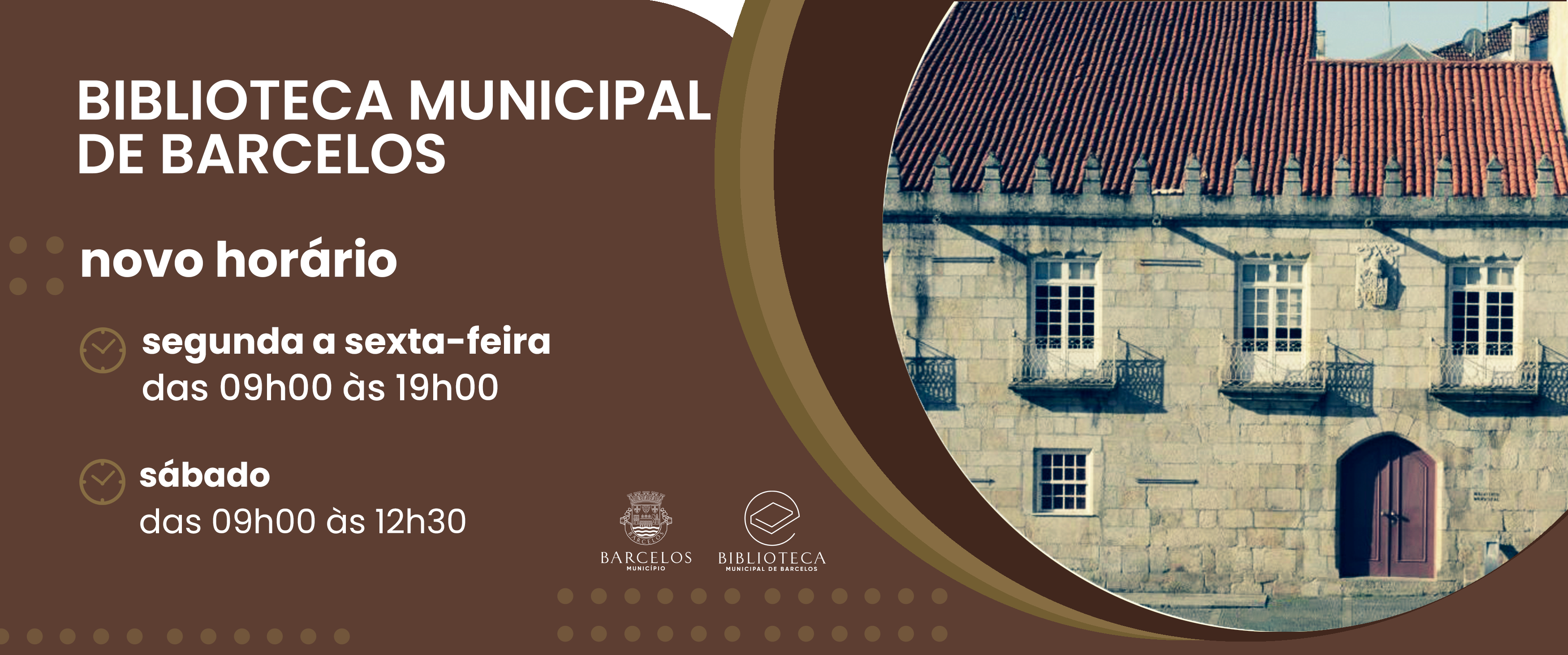 A Biblioteca Municipal de Barcelos alarga o horário de funcionamento para melhor responder à comunidade, passando a estar aberta ao público mais duas horas semanais, de segunda a sexta-feira, entre as 09h00 e as 19h00, e ao sábado, das 09h00 às 12h30. O novo horário entrará em vigor no dia 2 de maio.