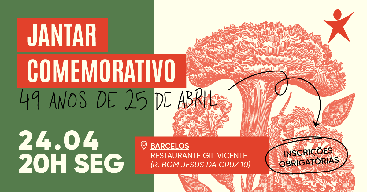 Com o objetivo de celebrar os 49 anos do 25 de abril, na próxima segunda-feira, dia 24 de abril, pelas 20h, o Bloco de Esquerda organiza um jantar comemorativo, que terá lugar no Restaurante Gil Vicente (R. Bom Jesus da Cruz 10).