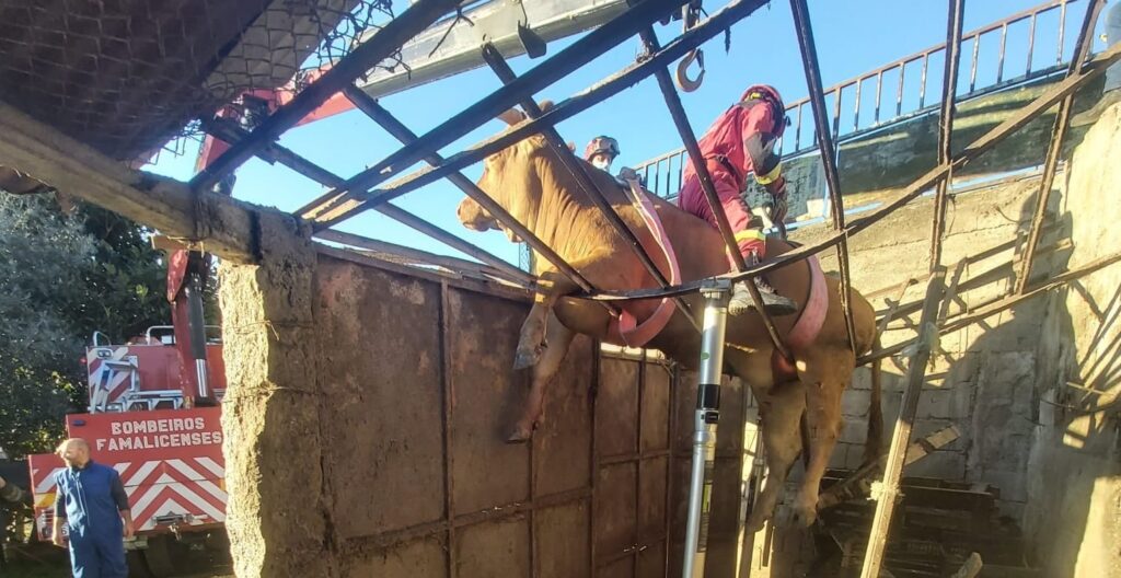 "O animal, com um peso aproximado de 700kg, caiu em cima do telhado de um anexo, num terreno agrícola e, para evitar ferimentos adicionais, foi resgatada com recurso à grua do nosso Veículo", escreveram os bombeiros Famalicenses no Facebook.