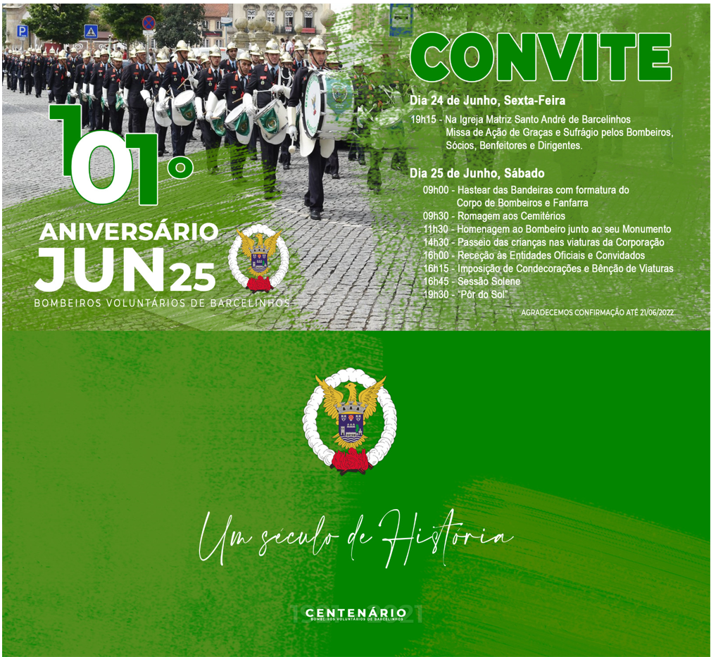 Os Bombeiros VoluntΓ‘rios de Barcelinhos comemoram no prΓ³ximo sΓ‘bado, dia 25 de junho, 101 anos de vida,Β com uma sessΓ£o solene, presidida pelo Senhor Ministro da AdministraΓ§Γ£o Interna, JosΓ© LuΓs Carneiro.