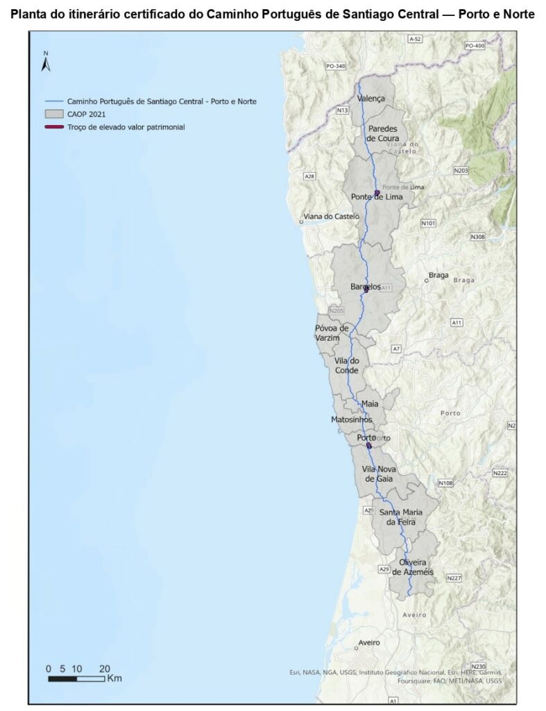 Certificação como itinerário do Caminho de Santiago o Caminho Português de Santiago Central - Porto e Norte "Com uma extensão de 177,8 km, o Caminho Português de Santiago Central - Porto e Norte atravessa 13 municípios: Oliveira de Azeméis, São João da Madeira, Santa Maria da Feira, Vila Nova de Gaia, Porto, Matosinhos, Maia, Vila do Conde, Póvoa de Varzim, Barcelos, Ponte de Lima, Paredes de Coura e Valença. A fundamentação da antiguidade do itinerário e do seu uso consistente, até ao presente, parte de estudos que provam a sua utilização regular pelas pessoas em trânsito entre a região do Douro e do Minho. Sobressaem as narrativas de peregrinações jacobeias realizadas entre os séculos XIV e XVIII por viajantes oriundos de vários países, cujos relatos fornecem-nos informações relevantes sobre o itinerário (orografia, templos religiosos, rede viária e espaços de apoio ao peregrino) que evidenciam a sua importância e dinâmica histórica. Fontes escritas são conciliadas com percursos pedestres preservados, vestígios arqueológicos associados à afirmação e expansão do culto em Portugal e exemplares de arquitetura religiosa e viária, entre os quais a Sé Catedral do Porto, a Igreja de Santiago de Custóias, a Igreja de Santiago do Couto, a Colegiada de Barcelos, o Mosteiro de Leça do Balio, o Mosteiro da Junqueira, a Igreja Românica de S. Pedro de Rates, a Capela de Santiago (Ponte de Lima), ou a Igreja Românica de Rubiães, a par de antigos hospitais e albergues, cruzeiros, nichos e pontes. Valorizam-se ainda as manifestações de cultura imaterial, a exemplo das lendas do Galo de Barcelos, da Rainha Santa Isabel e do Cavaleiro Cayo Carpo, para além da toponímia, de festividades cíclicas e outras práticas de culto relacionadas com o Caminho de Santiago. O itinerário assenta na antiga Estrada Real, que decalca em grande medida as principais vias romanas Norte-Sul (nomeadamente o itinerário XVI de Antonino entre Lisboa e Braga), que serviam de «espinha dorsal» dos Caminhos Portugueses de Santiago. O facto de o trajeto entre Porto e Valença ser o mais curto e retilíneo terá beneficiado do investimento na infraestruturação do percurso durante o período medieval, destacando -se o século XIII como a «idade de ouro» para a construção de pontes. O pedido de certificação do Caminho Português de Santiago Central - Porto e Norte tem a concordância dos municípios atravessados e apresenta condições de segurança, transitabilidade, equipamentos de apoio e informação. A sua certificação reflete os critérios constantes do anexo ao Decreto-Lei n. o 51/2019, de 17 de abril, e visa reconhecer e preservar o património cultural e natural associado ao Caminho de Santiago e assegurar os serviços de apoio adequados aos peregrinos.