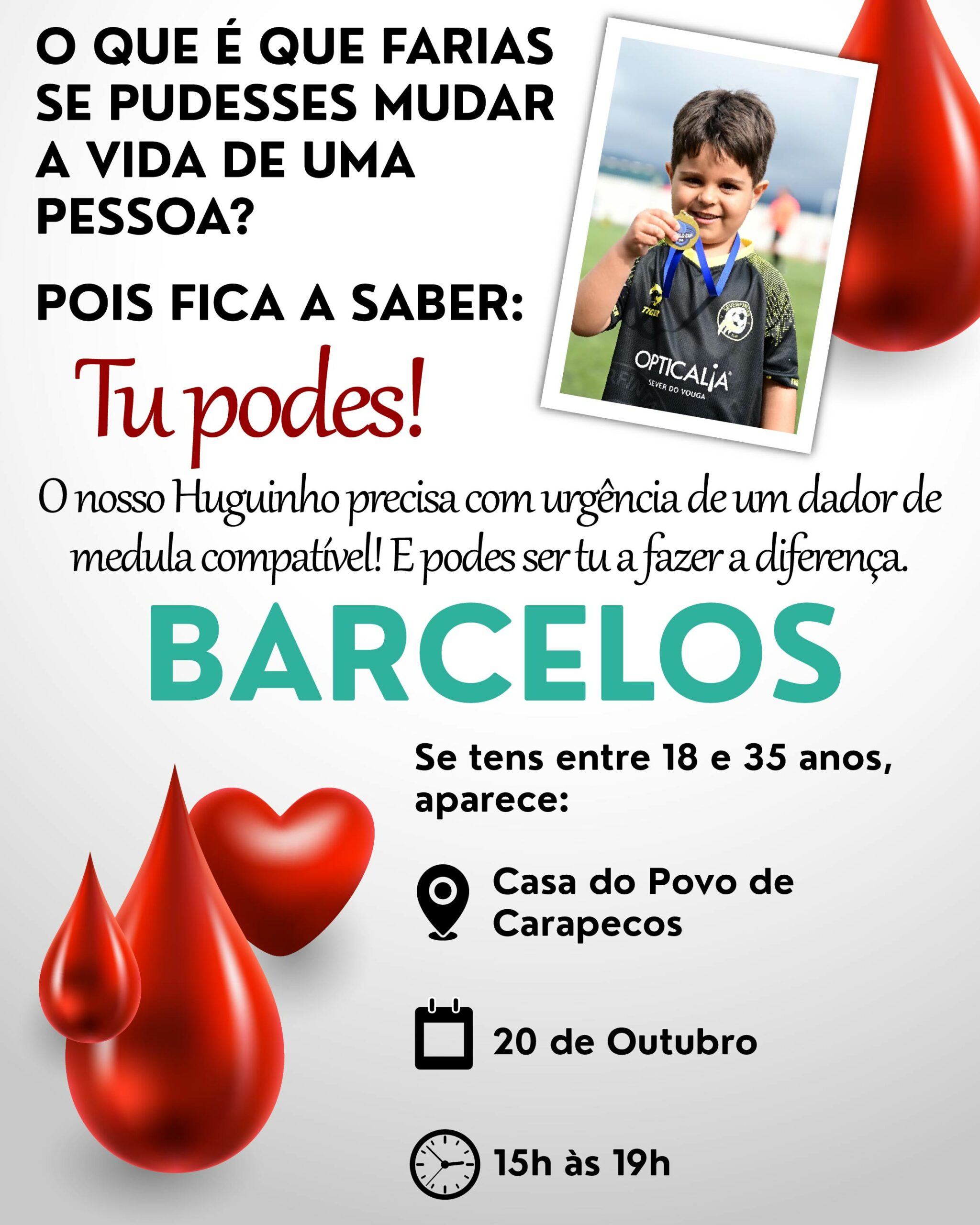 Dada esta situação, venho por este meio pedir a vossa preciosa colaboração na divulgação urgente de uma campanha de inscrição de dadores de medula óssea, que terá lugar em Barcelos, dia 20 de Outubro: