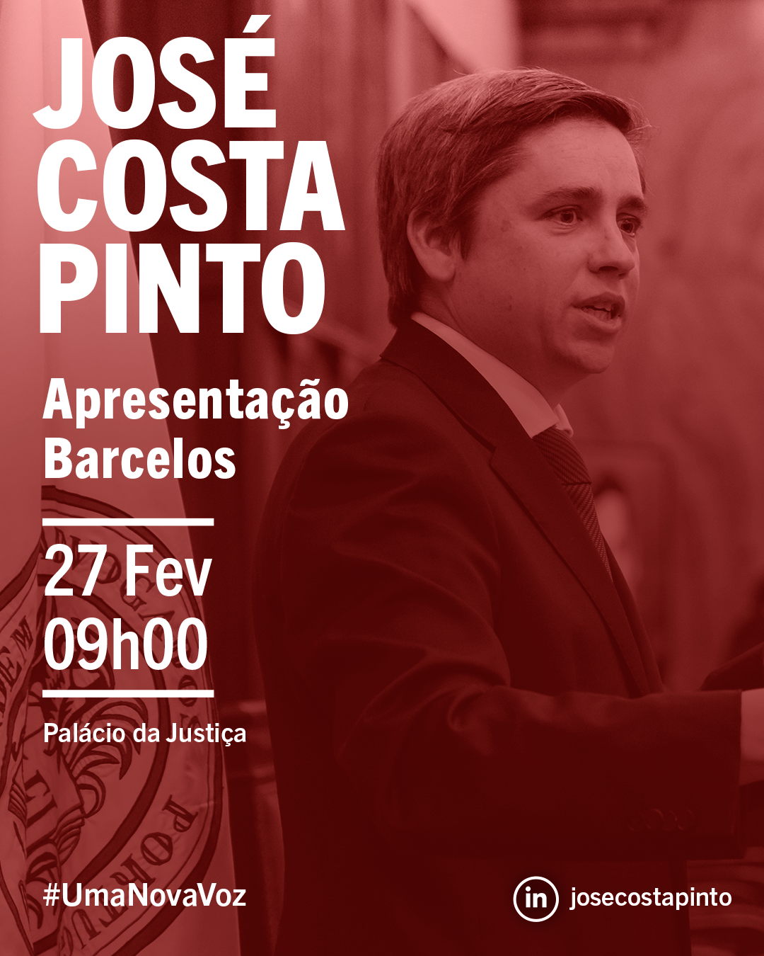 Com o mote "Uma Nova Voz", assumindo ser a única alternativa capaz de unir a Ordem dos Advogados e torná-la consequente na defesa dos Colegas e da profissão, José Costa Pinto quer elevar a fasquia para que a Casa da Advocacia esteja à altura dos advogados que representa e, com a campanha no terreno, abordar os desafios de um Advogado, seja onde for, num sinal claro de que a Advocacia não se esgota em Lisboa.
