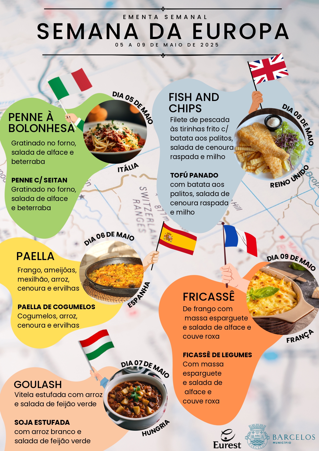 As cantinas escolares das escolas públicas do concelho de Barcelos estão a servir, esta semana, refeições típicas de diversos países europeus. Esta foi a forma que o Município de Barcelos escolheu assinalar junto dos mais jovens o Dia da Europa que se comemora oficialmente amanhã.