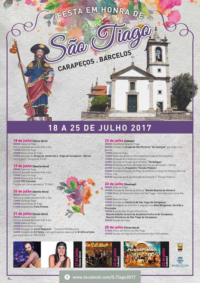 Hoje há espetáculo de fisio fitness. No domingo, após a procissão, pelas 18h30, atua o Rancho Infato Juvenil da Academia Cultural de Carapeços e o Rancho Folclorórico de S. Tiago de Carapeços. Na terça-feira, dia de S. Tiago, as festividades encerram com missa em honra do padroeiro.