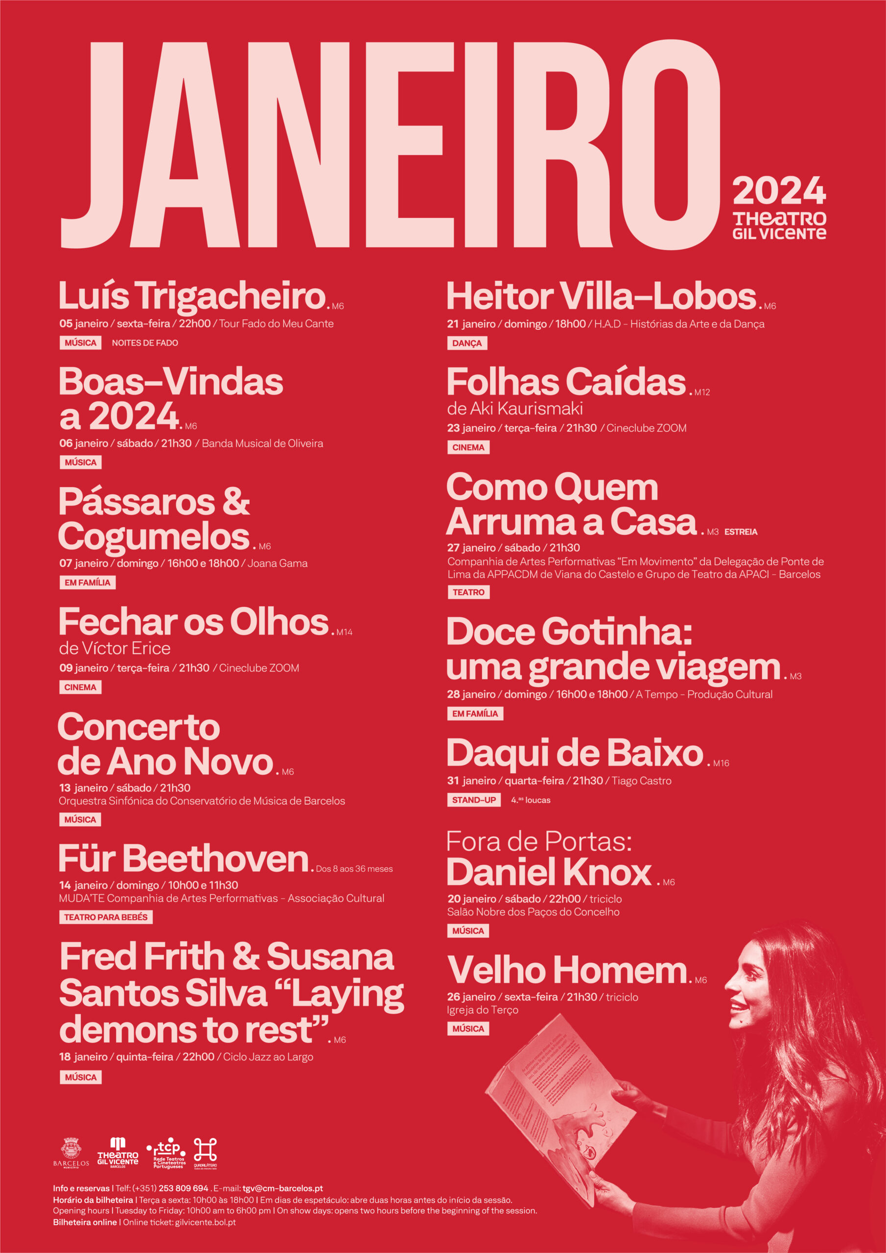 A programação do novo ano arranca logo no no dia 5, às 22h00, com Luís Trigacheiro, acompanhado por cinco músicos, com "Tour Fado do Meu Cante". No dia 6, é a vez do concerto Boas-Vindas a 2024, pela Banda Musical de Oliveira e a 13 de janeiro, o Concerto de Ano Novo, pela Orquestra Sinfónica do Conservatório de Música de Barcelos, com ambos os espetáculos agendados para as 21h30.