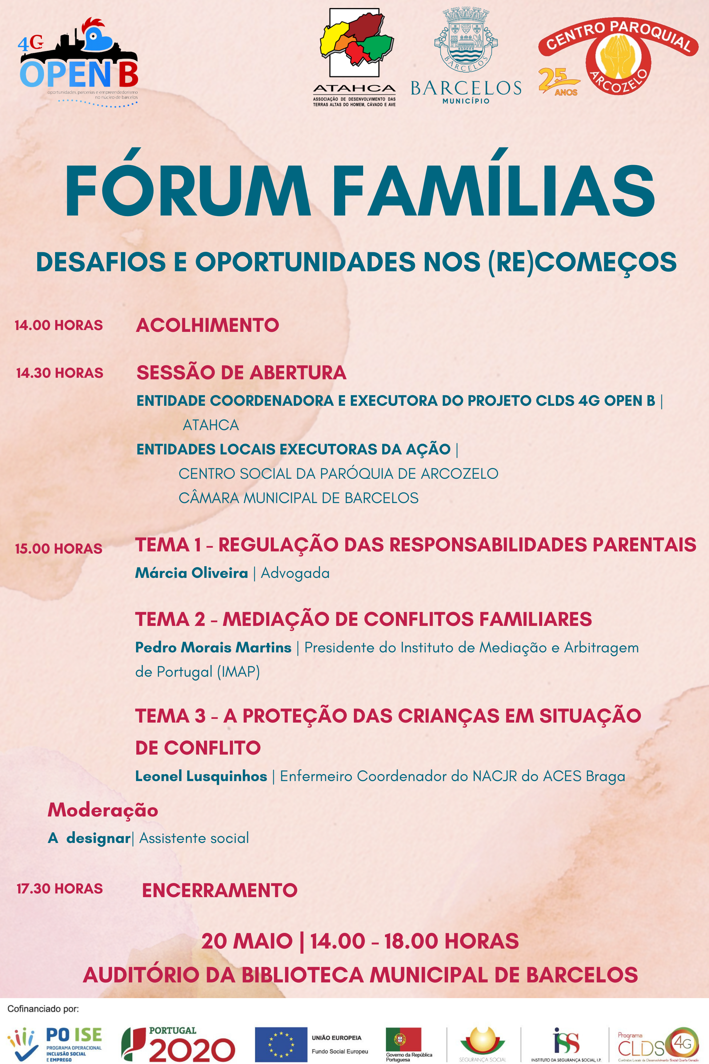 O CLDS 4G OPEN B, a Câmara Municipal de Barcelos e o Centro Social da Paróquia de Arcozelo, promovem, em conjunto, na próxima semana, a atividade "Semana da Família" a qual contempla a dinamização de um Workshop "Conhecer para intervir com pessoas LGBTQI+", no dia 16 de maio de 2022, entre as 9h30 e as 16h30, na sala makerspace da Biblioteca Municipal de Barcelos, a emissão em direto de um programa sobre Coparentalidade na Rádio Barcelos, no dia 18 de maio de 2022, entre as 18h e as 19h no Auditório da Casa da Juventude e, por fim, a realização de um Fórum Famílias "Oportunidades e desafios nos (Re)começos", no dia 20 de maio de 2022, no Auditório da Biblioteca Municipal de Barcelos, entre as 14h e as 18h.