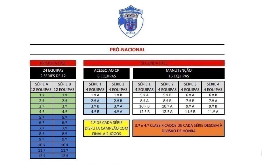 A Associação de Futebol de Braga revelou ainda, de forma oficial, o formato em que vai decorrer o campeonato Pró Nacional nesta época de transição. Os 24 clubes são divididos em duas séries de 12, com os quatro primeiros classificados de cada série a garantirem um lugar na fase de acesso ao Campeonato de Portugal. Aqui, os oito clubes são divididos em duas séries de quatro: os dois primeiros da série A juntam-se ao terceiro e quarto classificados da série B enquanto os dois primeiros da série B vão jogar contra os terceiro e quarto classificados da série A. O vencedor de cada série da fase de acesso ao Campeonato de Portugal vai depois disputar a final de apuramento de campeão, em dois jogos. O campeão será, naturalmente, o clube indicado para subir de divisão.