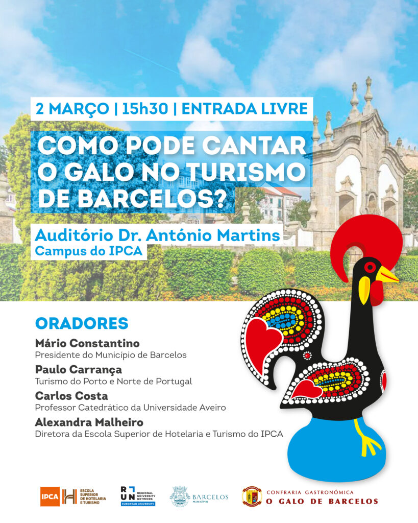A sessão terá como oradores Mário Constantino Lopes, Presidente do Município de Barcelos, Paulo Carrança, Turismo e Norte de Portugal, Carlos Costa, Professor Catedrático da Universidade de Aveiro, e Alexandra Malheiro, Diretora da Escola Superior de Hotelaria e Turismo do IPCA.