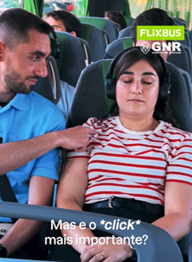 "As melhores viagens começam com um *click*: este é o mote da campanha que une a Guarda Nacional Republicana (GNR) e a FlixBus numa ação conjunta de sensibilização para a obrigatoriedade do uso do cinto de segurança a bordo dos chamados expressos. Com esta campanha, a GNR e a FlixBus pretendem reforçar a mensagem de que viajar com o cinto de segurança é mais do que uma obrigação legal: acima de tudo, é uma atitude responsável que protege os passageiros em caso de acidente, e que deve ser adotada por todos aqueles que viajam nos chamados expressos. Tal como acontece nas viaturas particulares, a não utilização do cinto de segurança nos autocarros de longo curso constitui uma infração à lei, sujeita a uma coima no valor mínimo de 120 euros.