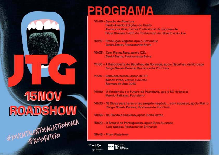 Para além das provas, o evento conta ainda com um Roadshow, que decorre entre as 10h e as 16h, no Auditório Municipal de Esposende. O Roadshow JTG conta com vários jovens chefes de cozinha convidados, pasteleiros, responsáveis de sala, sommelier e bartenders que se destacam a nível profissional e que passarão os conhecimentos aos que agora estão a iniciar a carreira de forma descontraída e divertida.