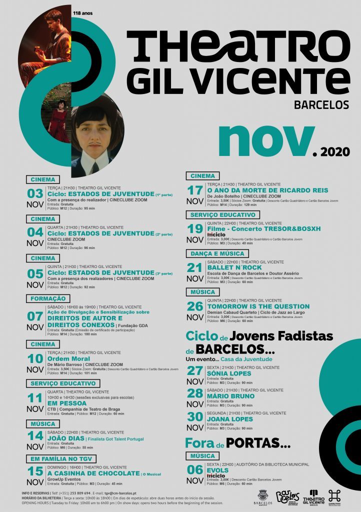 O cinema inicia a programação do Gil Vicente, com a Associação ZOOM – Cineclube de Barcelos a apresentar cinco noites de cinema: “Ciclo:Estados de Juventude (1.ª parte), no dia 3; “Ciclo:Estados de Juventude (2.ª parte), no dia 4; “Ciclo: Estados de Juventude (3.ª parte), no dia 5. Estas curta-metragens inserem-se no Dia Mundial do Cinema que se comemora a 5 de novembro.