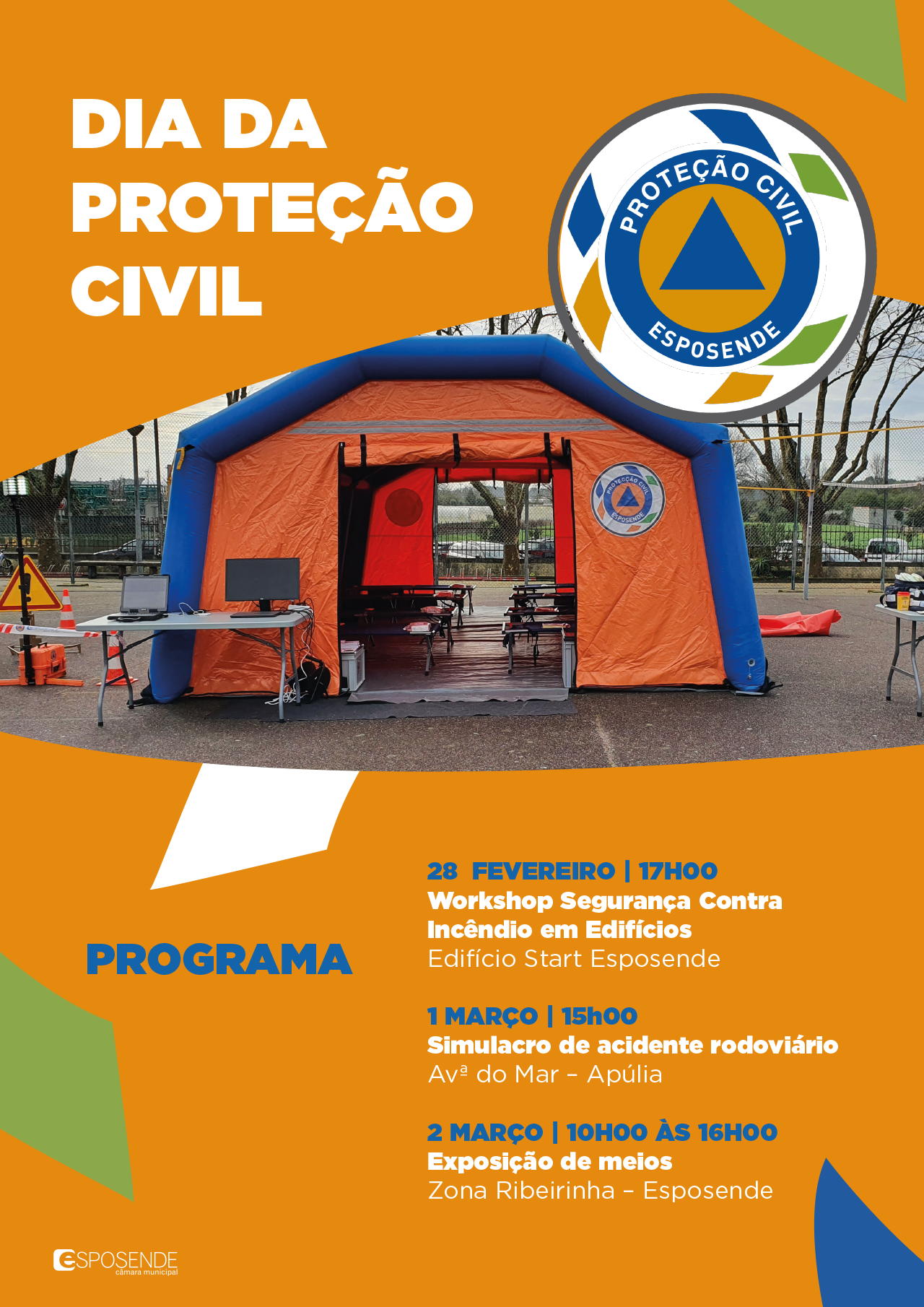 O workshop irá realizar-se na START Esposende, hoje, dia 27 de fevereiro, pelas 17h, na START Esposende, e abordará a segurança contra incêndio em edifícios. No dia 1 de março, sábado, pelas 15 horas, a avenida do Mar, em Apúlia, será cenário de um simulacro de acidente rodoviário e no domingo, dia 2, a Zona Ribeirinha de Esposende acolhe a exposição dos mecanismos ao serviço de um melhor desempenho das várias entidades componentes da Proteção Civil Municipal.