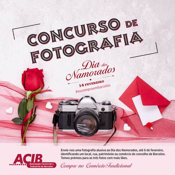 https://acib.eu/pt/noticias/concurso-de-fotografia-dia-dos-namorados) e enviar uma fotografia alusiva a Barcelos e ao Dia dos Namorados. Posteriormente a ACIB publica as fotografias na página do Facebook. Depois é só convidar os seus amigos para fazerem "Gosto" na sua fotografia. A fotografia com mais "Gostos" será a vencedora e receberá uma noite para duas pessoas no Hotel Bagoeira. A segunda fotografia mais "votada" será contemplada com um jantar para duas pessoas no Restaurante Galliano e a terceira uma massagem para duas pessoas no SPA Maria Beleza Vaz. O concurso decorre até às 18h00 do dia 13 de fevereiro de 2025. No entanto, as fotografias deverão ser enviadas, por email (
