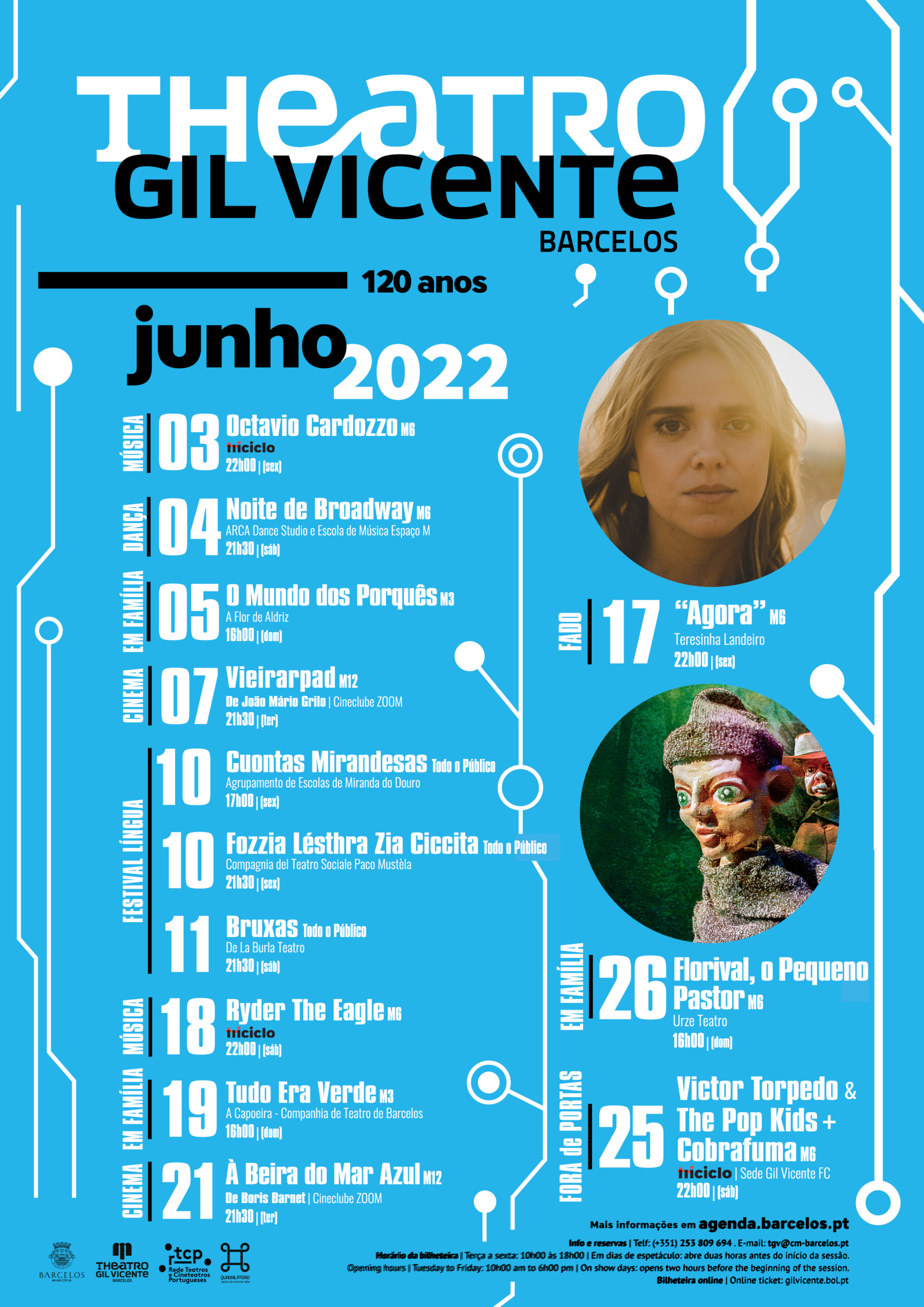 São treze espetáculos ao longo de um só mês: um mês em cheio no Theatro Gil Vicente, com destaque para o Língua - Festival Internacional de Teatro em Línguas Minoritárias que decorre, em Barcelos, nos dias 10 e 11 de junho. Mas, este ciclo de programação mensal inicia com música, já no dia 3 de junho, pelas 22h00, com um concerto de Octavio Cardozzo, uma das mais importantes vozes da música contemporânea brasileira e da música LGBTQIA+ do país, no âmbito do ciclo de concertos 'triciclo'. Música que está de volta ao Theatro, no dia 17, às 22h00, com a jovem fadista e compositora Teresinha Landeiro, que vem a Barcelos apresentar "Agora", o seu mais recente álbum. Um dia depois, 18, pelas 22h00 acontece o espetáculo "Ryder The Eagle", mais uma iniciativa 'triciclo'. Fora de portas, a Sede Gil Vicente FC recebe, no dia 25 de junho, às 22h, o espetáculo de rock'n'roll"Victor Torpedo & The Pop Kids + Cobrafuma", também inserido no ciclo de concertos 'triciclo.