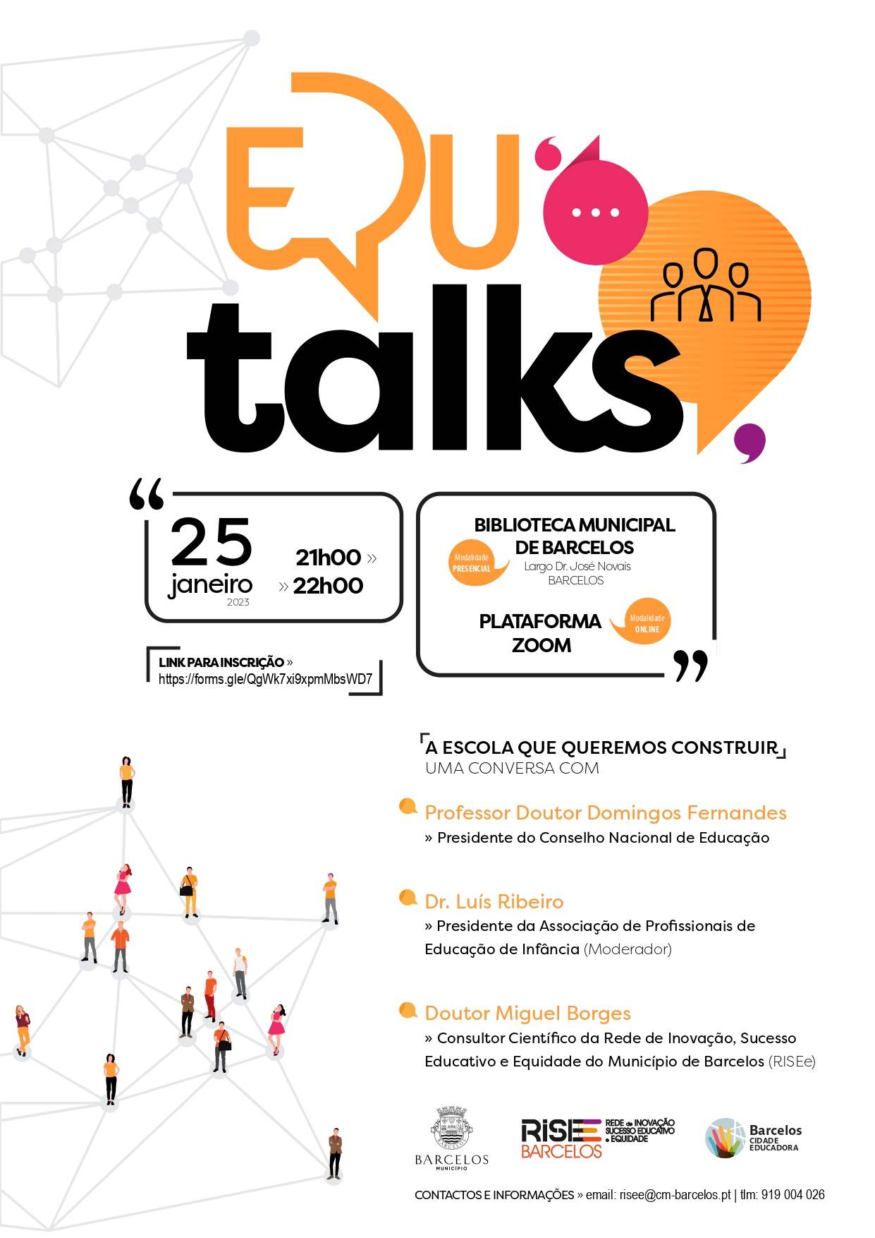 O Município de Barcelos promove no próximo dia 25 de janeiro, às 21h00, na Biblioteca Municipal de Barcelos, a ação "EDU Talks", inserida no plano de ação da Rede de Inovação, Sucesso Educativo e Equidade (RISEe) - Barcelos.