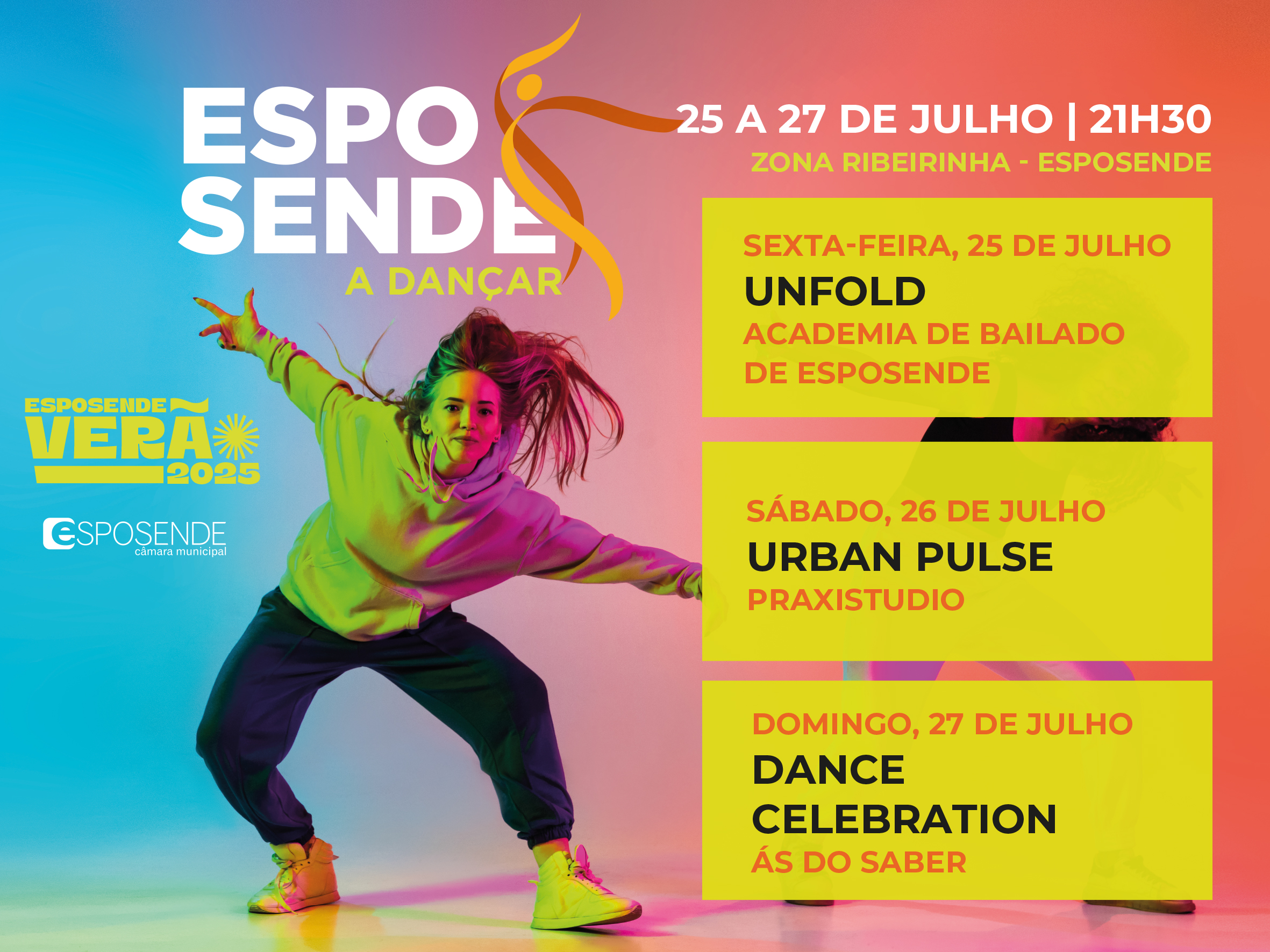 No âmbito da programação Esposende Verão 2025, o evento traz ao público a energia, criatividade e talento das academias de dança locais, nomeadamente Academia de Bailado de Esposende, PraxiStudio e Academia Ás do Saber. Serão realizados três espetáculos, todos com entrada livre e início às 21h30, que assinalam o final do ano letivo destas academias. Esta iniciativa reúne centenas de crianças e jovens em palco, valorizando a dança e a cultura no concelho.