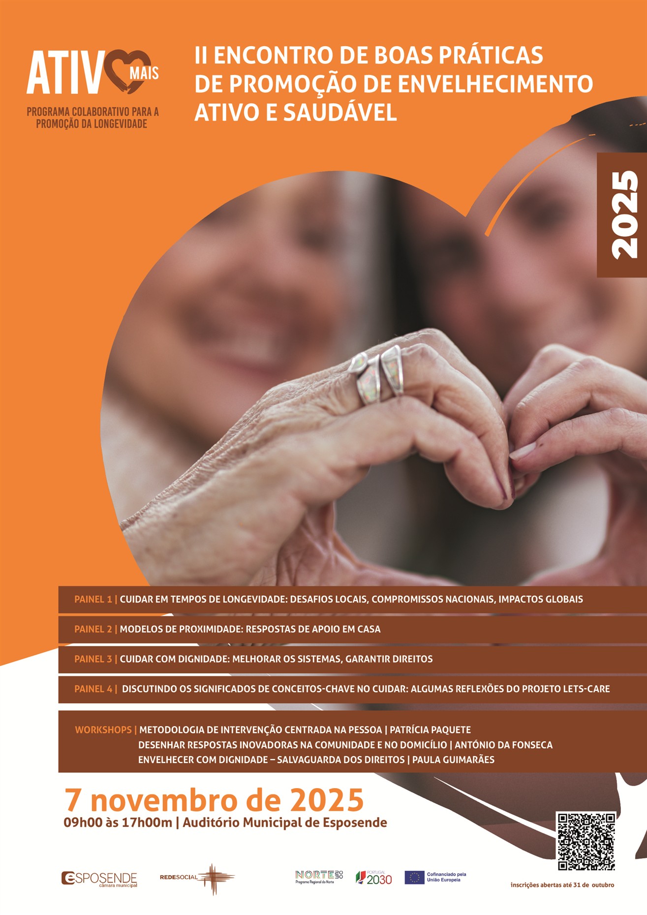 Este Encontro está estruturado em dois momentos complementares; no período da manhã em formato de conferência e, no período da tarde, em workshops temáticos. O programa assenta nas principais tendências e desafios identificados a nível local e nacional nos domínios da longevidade, dos cuidados e da dignidade na velhice. Com uma abordagem que vai do território e das vivências individuais até às políticas públicas e à inovação social, pretende-se criar um espaço de diálogo entre a investigação, a prática e a política, reforçando a cidadania e a qualificação das respostas sociais.