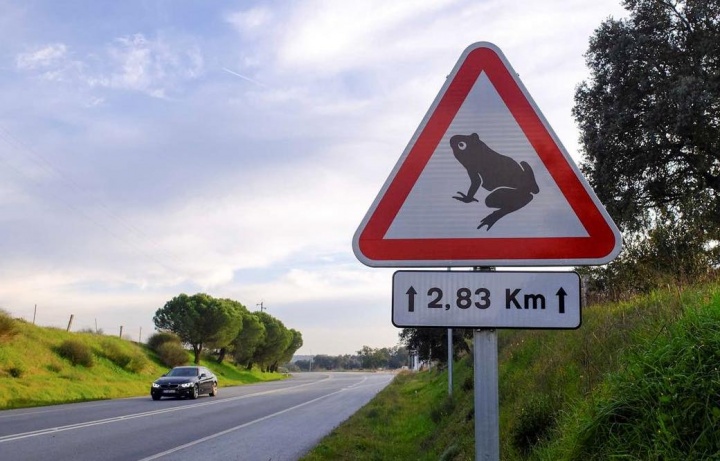 Entre os sinais de perigo, surgem a aproximação de uma passagem para velocípede, o aviso de que a via pode ser atravessada por linces-ibéricos e por anfíbios.