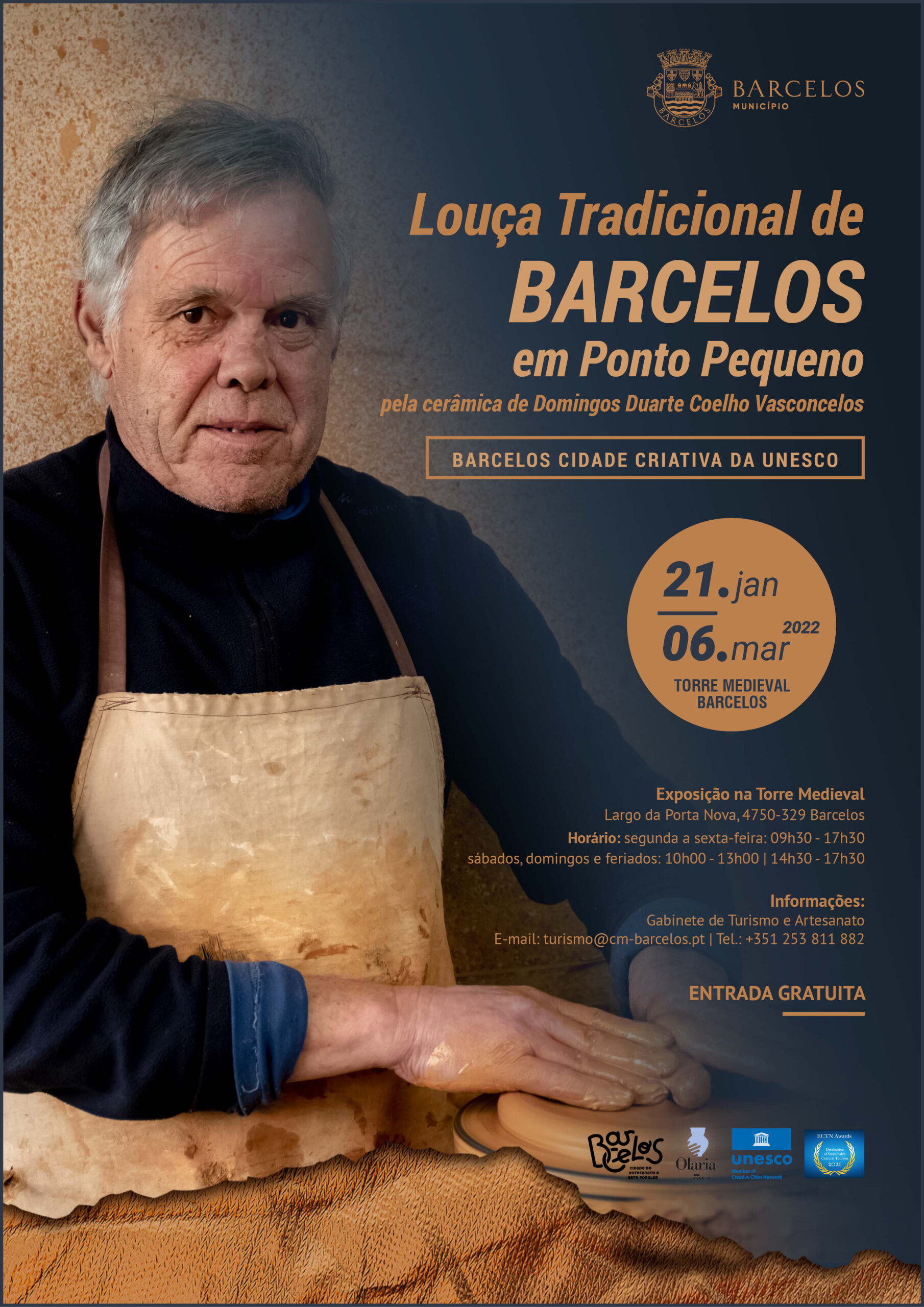 Abre ao público, amanhã (21 de janeiro), pelas 17h00, na Torre Medieval de Barcelos, a exposição "Louça Tradicional de Barcelos em Ponto Pequeno", pela cerâmica de Domingos Duarte Coelho Vasconcelos. A mostra pretende dar a conhecer o trabalho deste oleiro que dedicou toda a sua vida profissional à produção de louça de barro, assim como promover a divulgação e valorização da Olaria de Barcelos, atividade que faz parte da herança cultural do concelho e pertence ao quadro do Registo Nacional de Produções Certificadas.