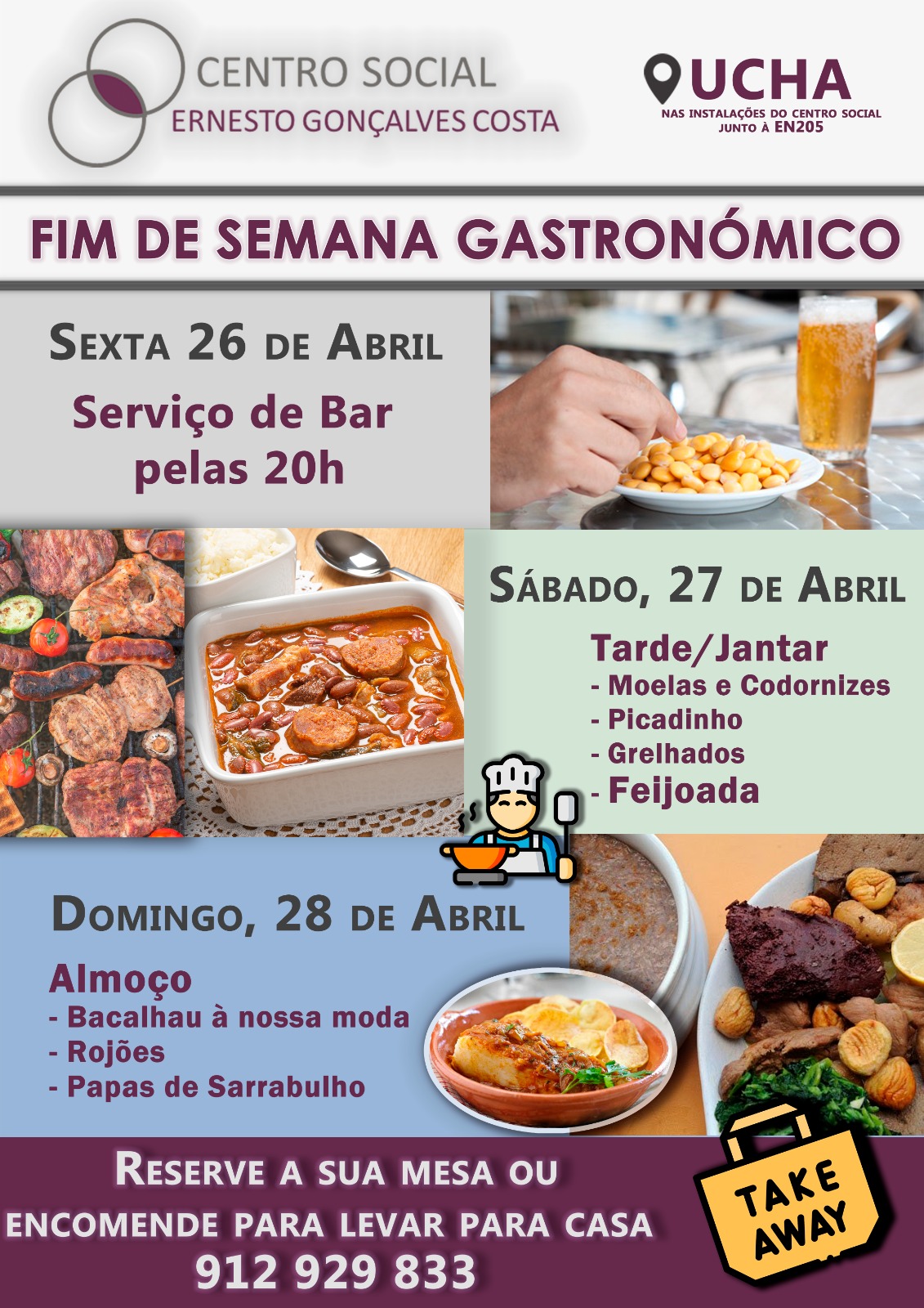 Estão de regresso os fins de semana gastronómicos do Centro Social Ernesto Gonçalves Costa, na Ucha. Esta sexta-feira, dia 26 de abril, a abertura do bar acontece pelas 20h. Depois, a iniciativa prossegue nos dias 27 e 28, com jantar no sábado e almoço no domingo. A refeição pode ser feita no local – nas instalações do Centro Social, junto à EN205 – ou em regime de take-away.